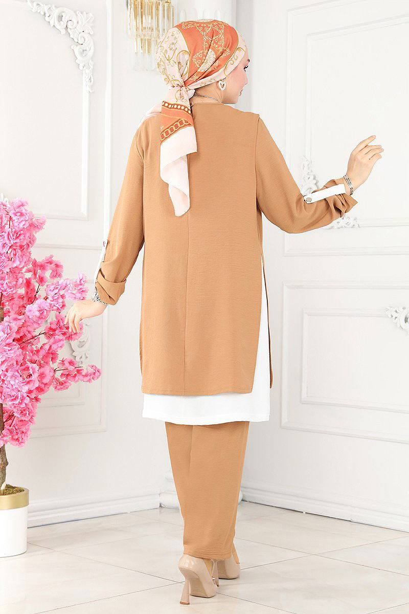 Product Feature : It is a new season hijab fashion product. It has a button that can be used from the back. The product has a Cycling collar. The inner tunic is sewn to the product. Necklace is included in the product, may not be used upon request. The waist of the trousers is elastic. Cuff buttons are active. There may be a tonal difference in the product due to concept photo shoots.