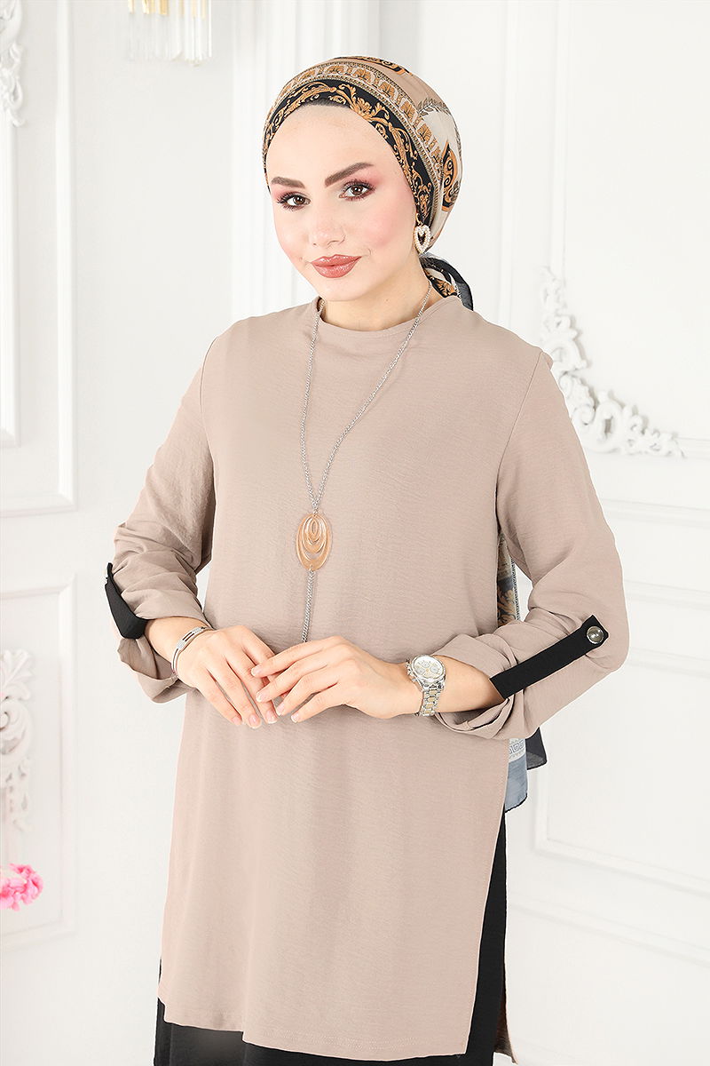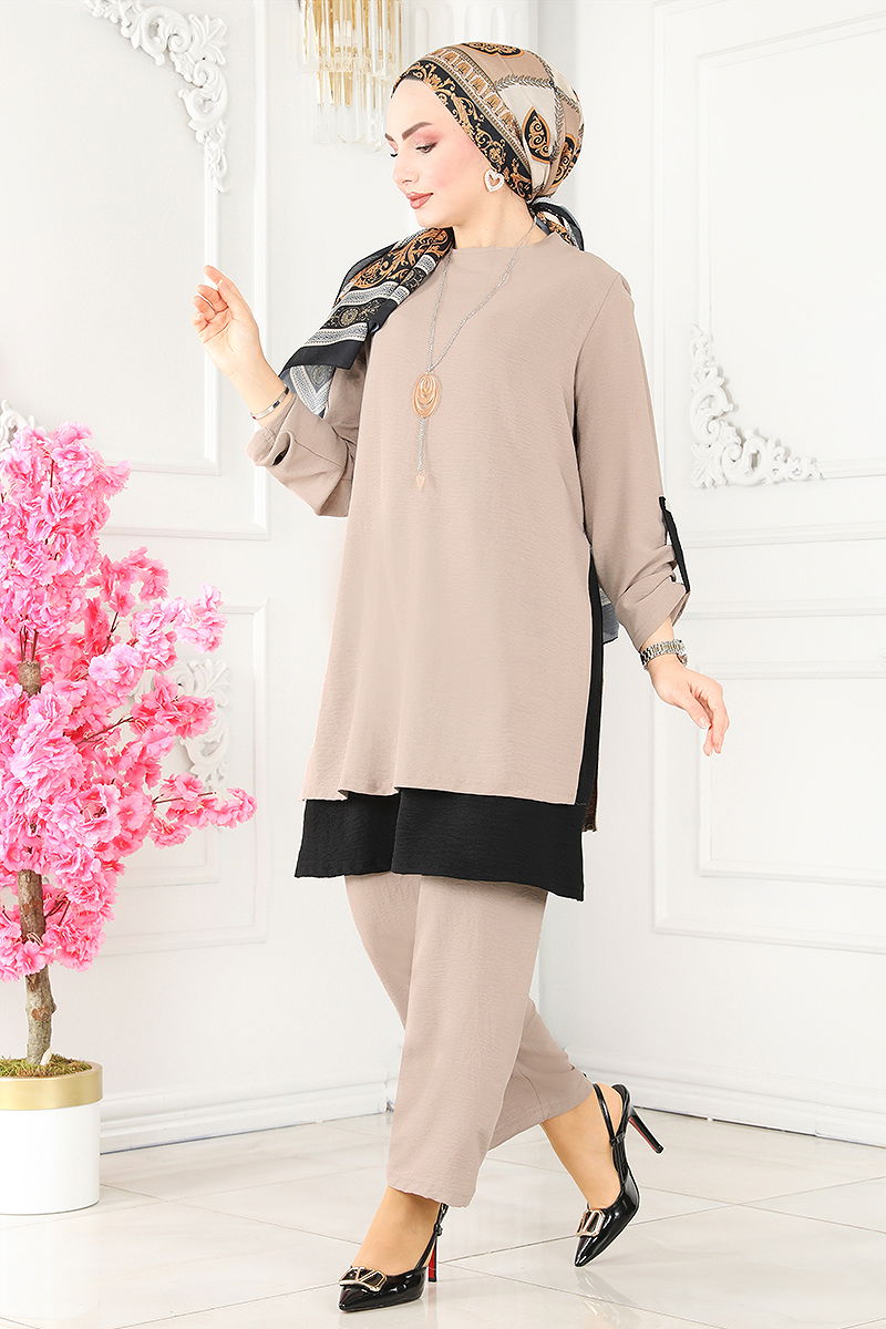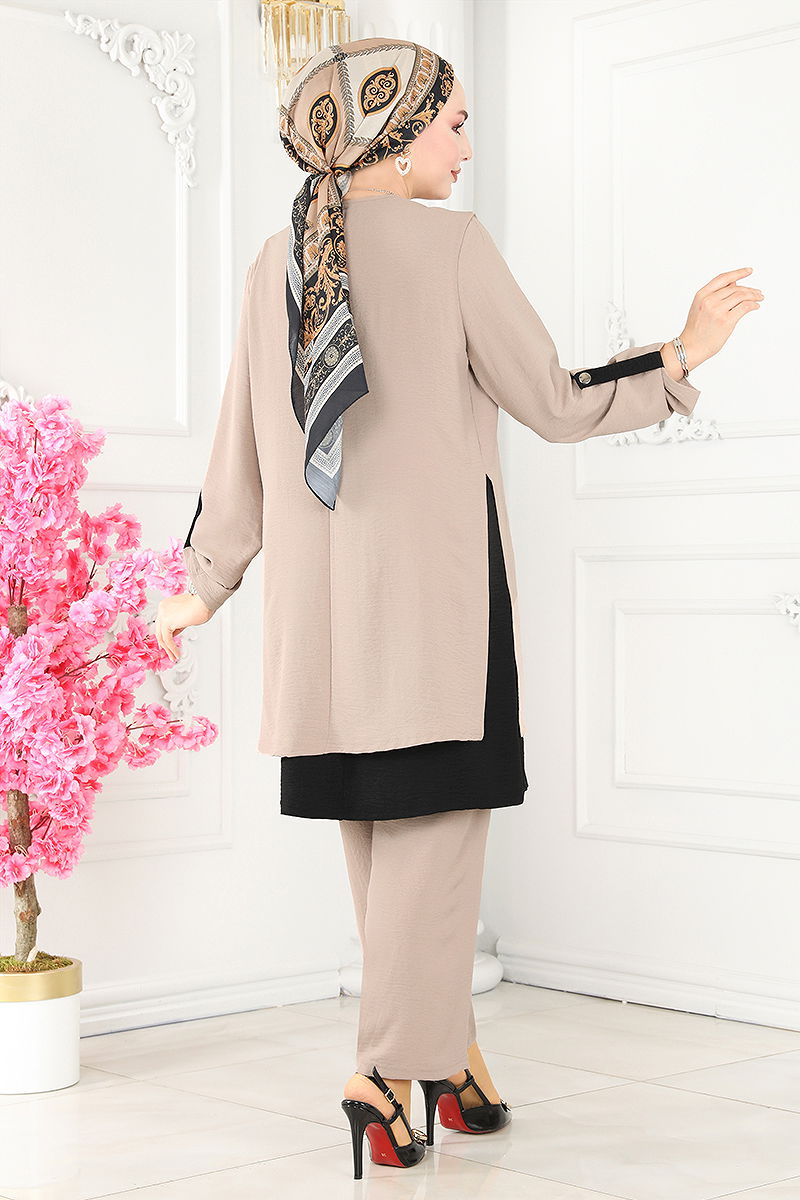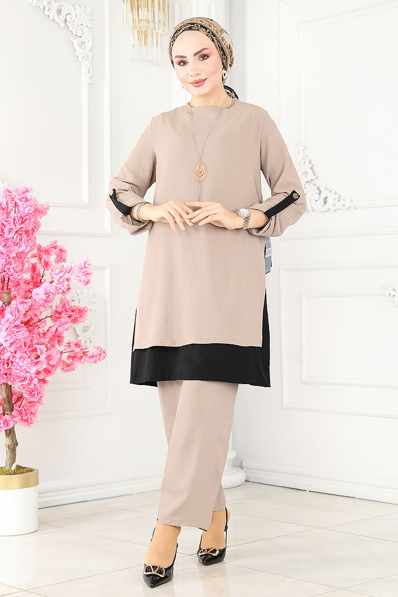 Product Feature : It is a new season hijab fashion product. It has a button that can be used from the back. The product has a Cycling collar. The inner tunic is sewn to the product. Necklace is included in the product, may not be used upon request. The waist of the trousers is elastic. Cuff buttons are active. There may be a tonal difference in the product due to concept photo shoots.