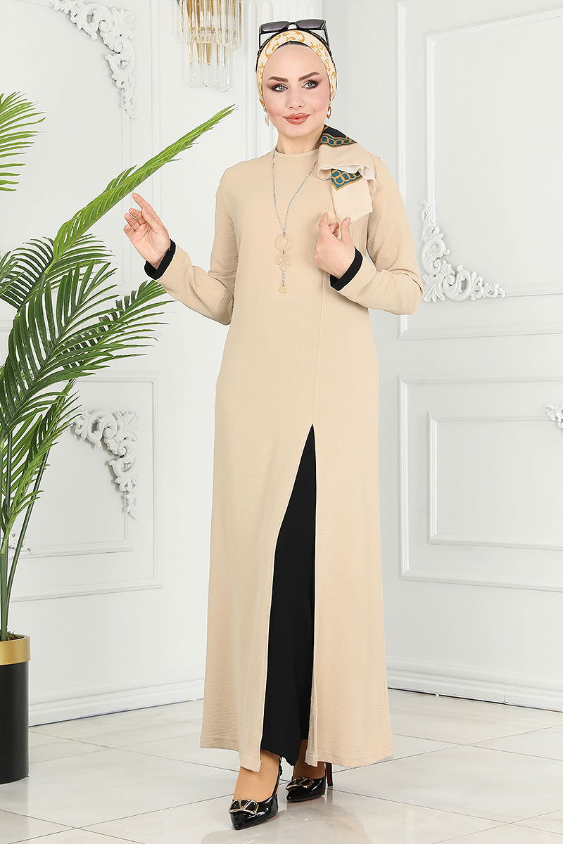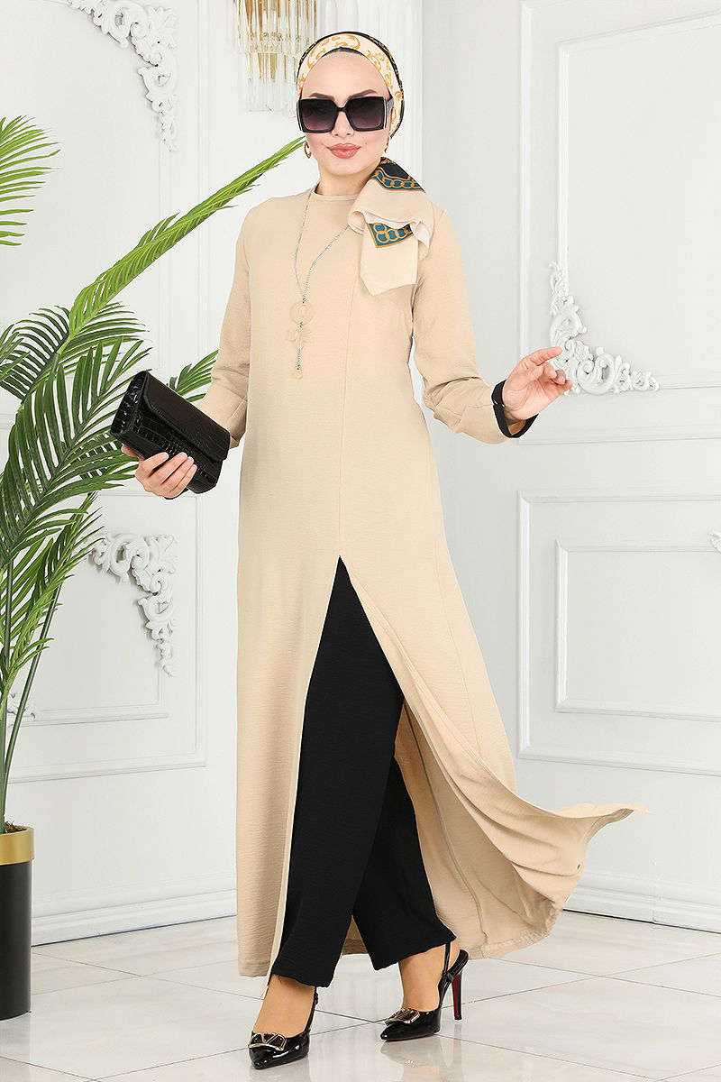 Product Feature : It is a new season hijab fashion product. It has a button that can be used from the back. The product has a Cycling collar. The tunic has a front slash.. Unlined. Accessories are not included. The waist of the trousers is elastic. There may be a tonal difference in the product due to concept photo shoots.