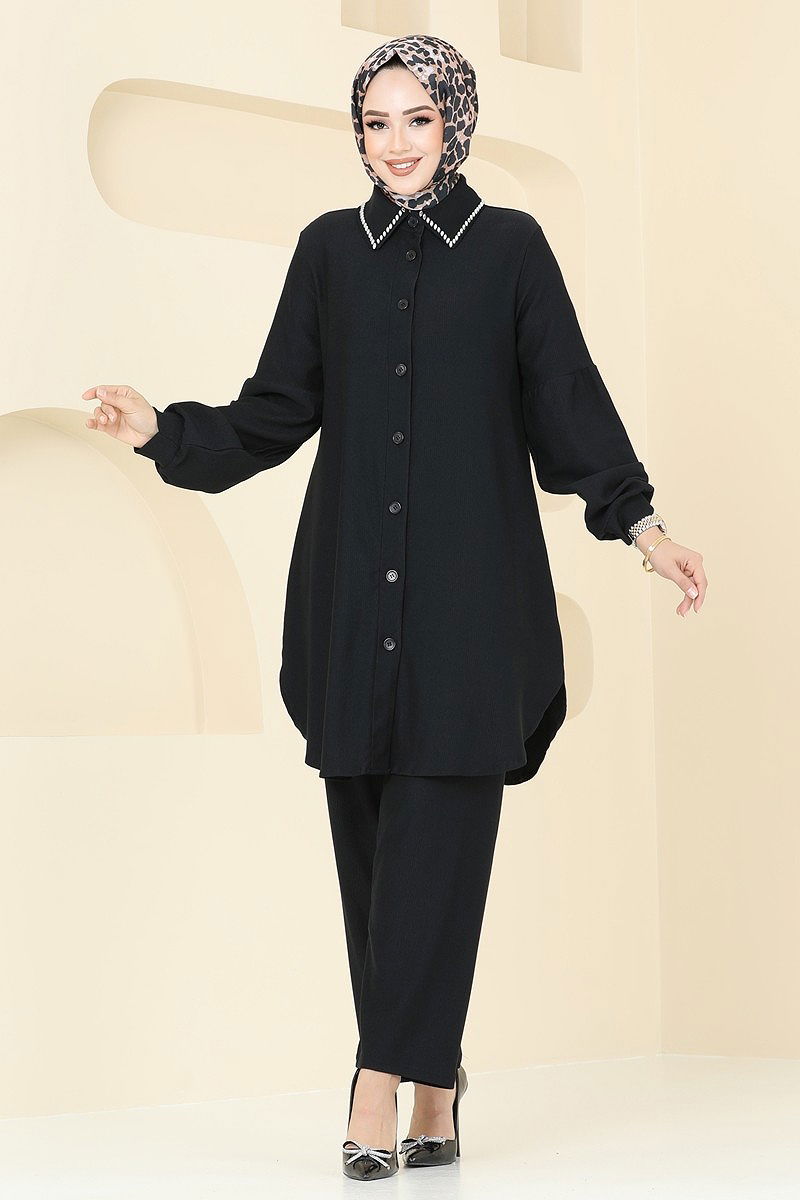 المنتج لديه ياقة القميص. المنتج به أزرار من الأمام. غير مبطنة. يتم لصق الحجارة. خصر البنطال مرن. قد يكون هناك اختلاف في الدرجة اللونية في المنتج بسبب التقاط الصور الفوتوغرافية.