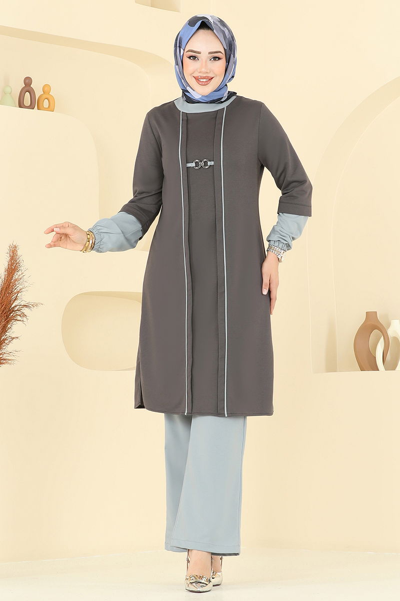 The Accessory Detail Hijab Set is a versatile modest wear suitable for all seasons. This set can be washed at 30 degrees on a delicate cycle. It is made from double-threaded quality fabric and features a collarless design with a zipper at the back. The non-tarnish metal accessories and detailed stitching enhance its aesthetic appeal. The waistband of the pants is elastic, providing extra comfort along with elasticated cuffs on both the tunic and pants. Measurements of the model: Height: 165 cm, Chest: 88 cm, Waist: 68 cm, Hips: 99 cm, Weight: 56 kg. A stylish and modern choice that complements your style.