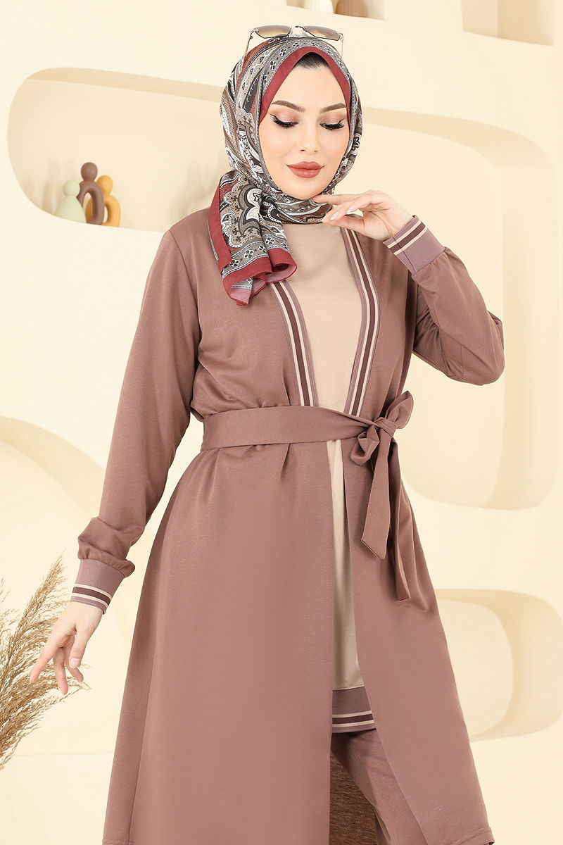 Ribana Detailed Triple Set is a special design model categorized under modest wear. This set, which can be comfortably used in all seasons, can be cleaned with mild washing at 30 degrees. Made from dual thread fabric, it is unlined. The belt is designed to prevent wavering and can be removed if preferred, offering versatile styling options. The pants have an elastic waistband for comfort. Comprising a Tunic, Pants, and Cardigan, this elegant and comfortable set promises to keep you stylish in any setting and is a must-have addition to your wardrobe.