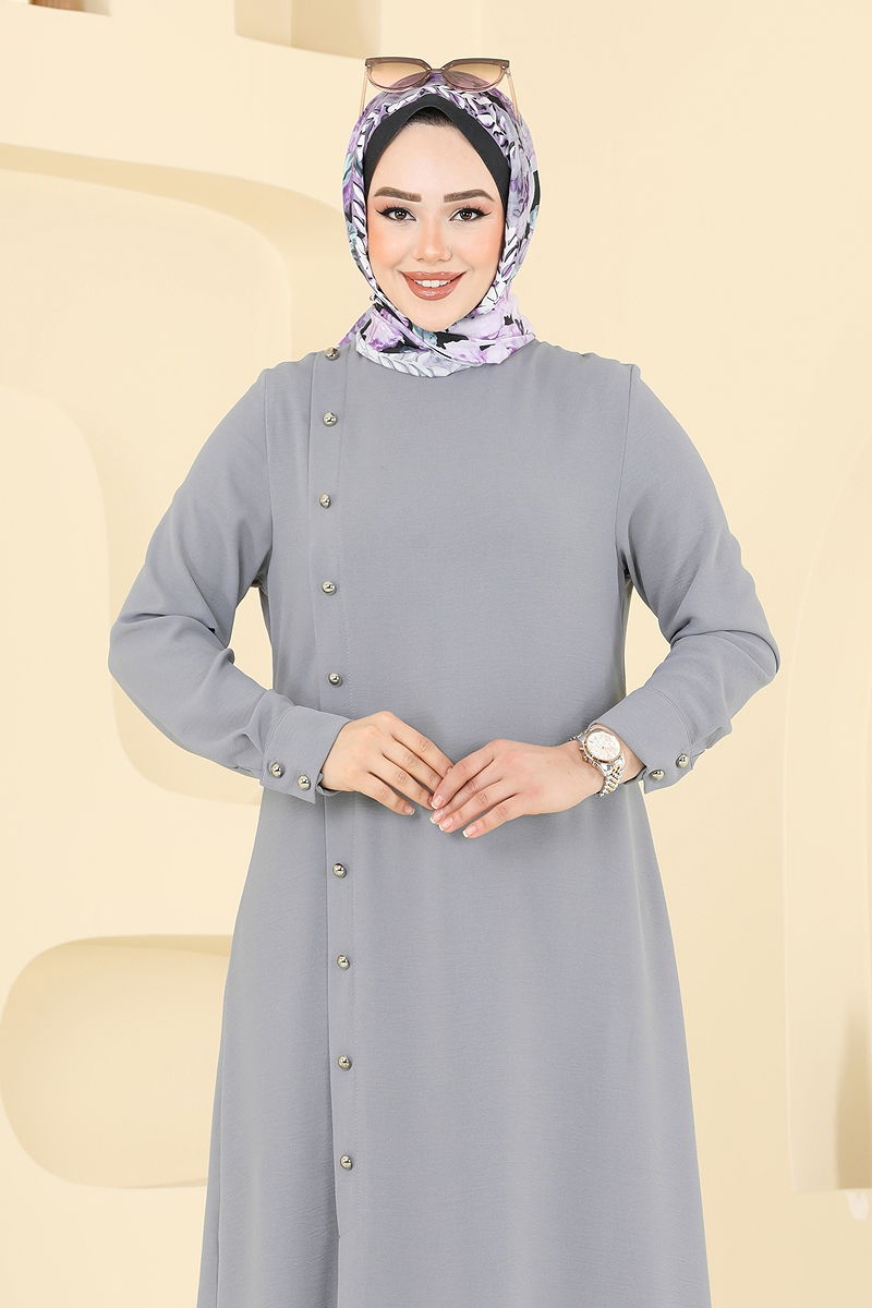 The Accessory Buttoned Twin Set model is a modest wear product suitable for all seasons. Made from aerobin fabric, this set features a bicycle neck and slit details that catch the eye. Its lining-free design is completed with functional button accessible from the back and stylish accessory buttons. The pants have an elastic waist, offering comfortable use with the tunic. Active buttons on the cuffs enhance usability. This stylish and functional twin set can be washed gently at 30 degrees.