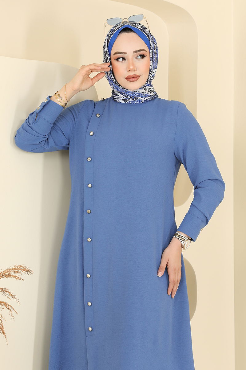 The Accessory Buttoned Twin Set model is a modest wear product suitable for all seasons. Made from aerobin fabric, this set features a bicycle neck and slit details that catch the eye. Its lining-free design is completed with functional button accessible from the back and stylish accessory buttons. The pants have an elastic waist, offering comfortable use with the tunic. Active buttons on the cuffs enhance usability. This stylish and functional twin set can be washed gently at 30 degrees.