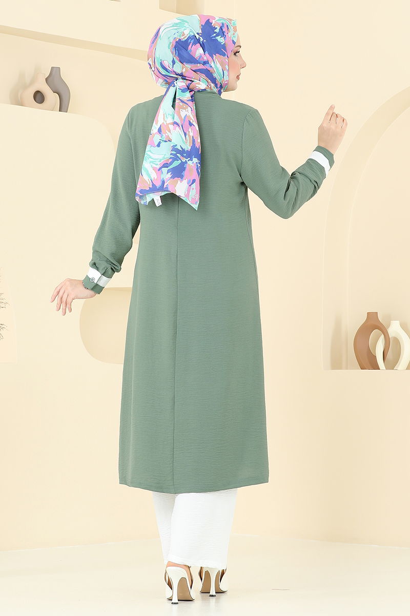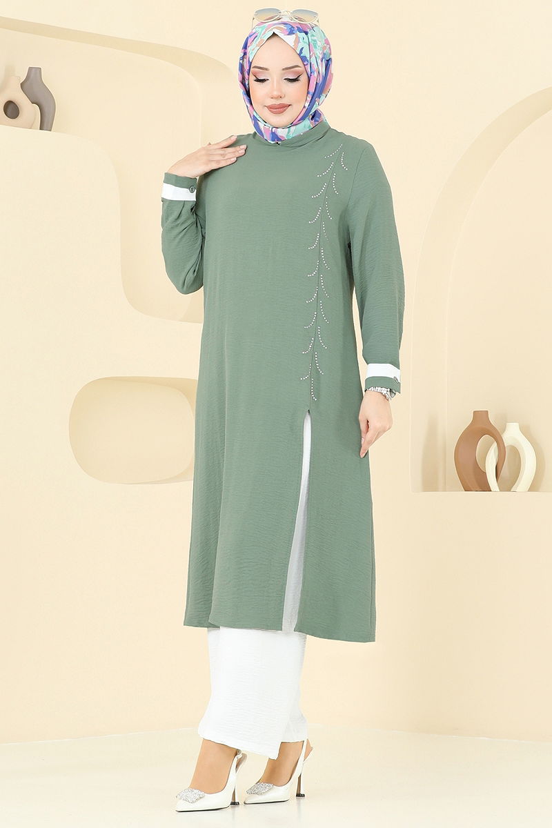 Add a touch of elegance to your modest wardrobe with the Stone-Detailed Modest Suit. Made from aerobin fabric, this suit can be comfortably worn across all seasons. The half stand-up collar and zipper detail provide both practicality and style. The elastic waistband of the pants offers maximum comfort, while the tunic complements it aesthetically. With slit details and active cuff buttons, this outfit brings a dynamic flair. It can be washed gently at 30 degrees.