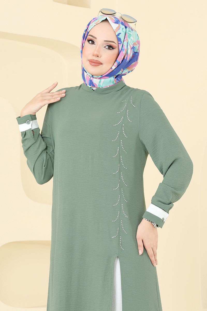 يتم ارتداء المنتج على الرأس. المنتج لديه ياقة نصف بيضوية. يحتوي على فتحة. غير مبطنة. المنتج به سحاب في جزء من الخلف. يتم لصق الحجارة. خصر البنطال مرن. أزرار الكفة نشطة. قد يكون هناك اختلاف في الدرجة اللونية في المنتج بسبب التقاط الصور الفوتوغرافية.