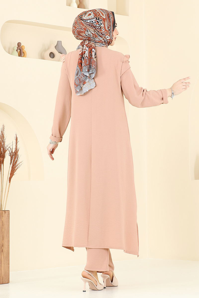 Product Feature : It is a new season hijab fashion product. It has a button that can be used from the back. The product has a Cycling collar. Unlined. Details are sewn. The waist of the trousers is elastic. There may be a tonal difference in the product due to concept photo shoots.