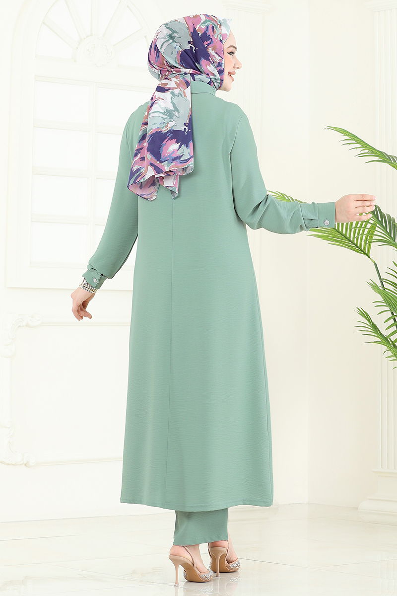 Product Feature : It is a new season hijab fashion product. The product has a Shirt collar. The product has Secret buttons. Unlined. The stones are glued. Blouse is not included. Sample combination is made with the blouse to show the intended use of the product. The waist of the trousers is elastic. Cuff buttons are active. There may be a tonal difference in the product due to concept photo shoots.