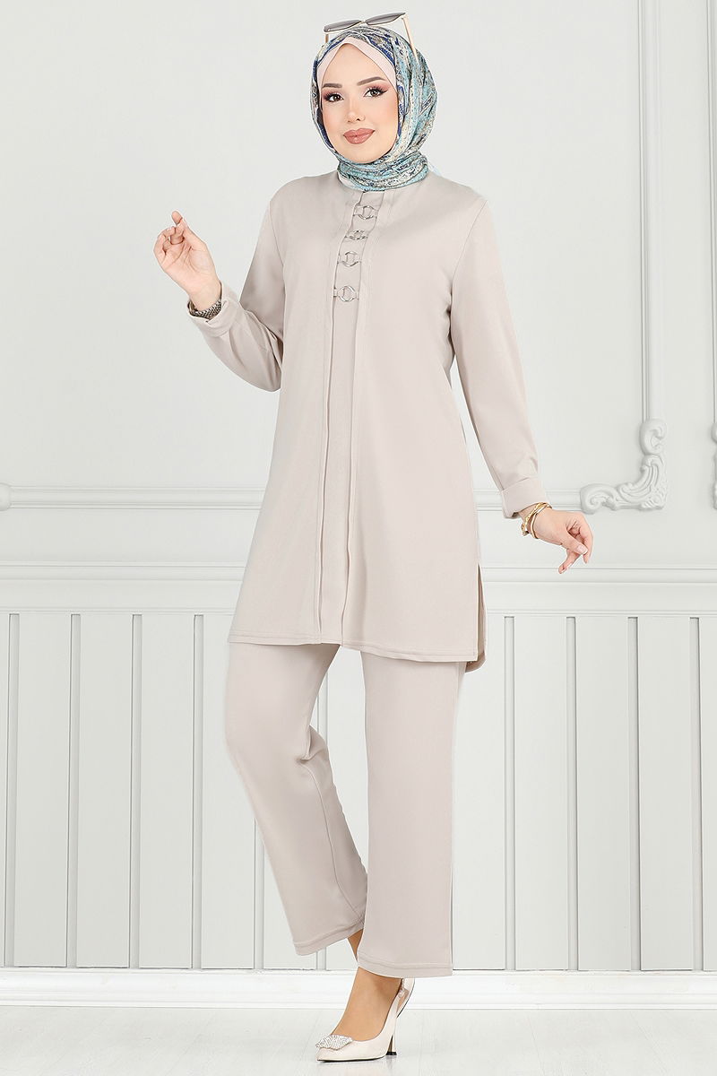 The Ring Detailed Hijab Suit is a stylish hijab product suitable for use in all seasons. It can be washed gently at 30 degrees and is made from crepe fabric. Featuring a crew neck design, this model is unlined and can be easily worn over the head. The metal accessories used in the product are non-tarnishing, and all details are carefully stitched. The elastic waistband of the pants offers comfortable use. This chic and practical combination comes as a set with a Tunic and Pants.