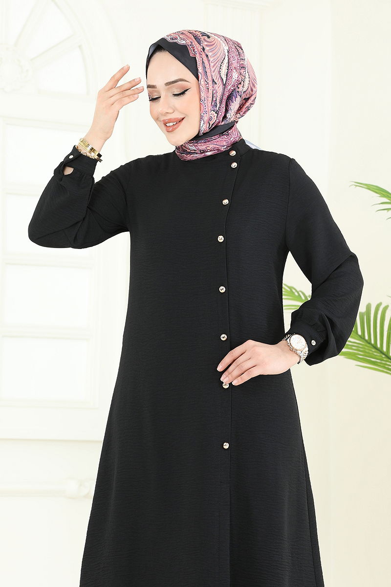 Offering both comfort and elegance, the Front-Buttoned Aerobin Suit is a modern touch to modest fashion. This suit, which can be joyously worn in all seasons, is made from aerobin fabric that is suitable for gentle wash at 30 degrees. Its semi-mandarin collar and front-button design provide practical usage, while the slit details offer freedom of movement and the unlined structure gives a lightweight feel. With an elastic waistband in the pants and a tunica length that ensures a comfortable fit, the functional cuff buttons add utility to this ensemble, promising a sophisticated look in any setting.