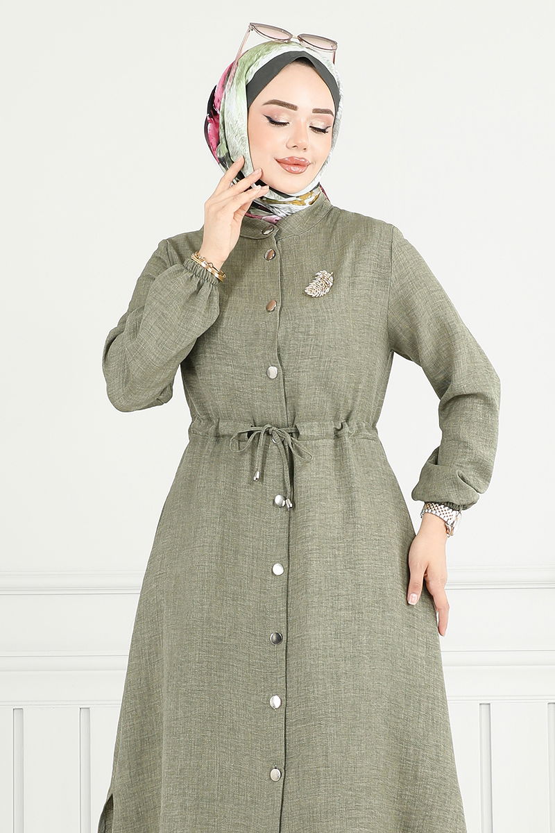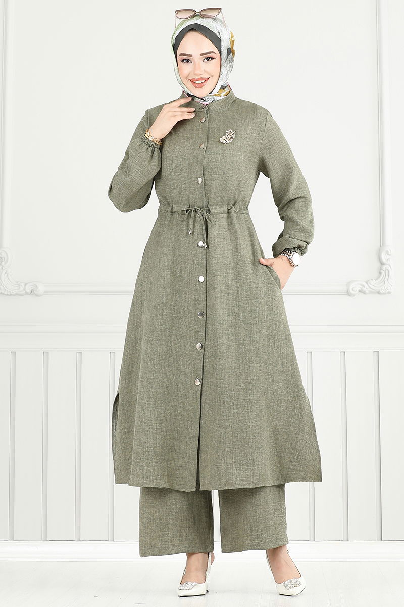 Product Feature : It is a new season hijab fashion product. It has a laced waist. The product has a Half Judge collar. The product has From the front buttons. The tunic has a side slash.. Unlined. The waist of the trousers is elastic. The cuff is rubberized. There may be a tonal difference in the product due to concept photo shoots.