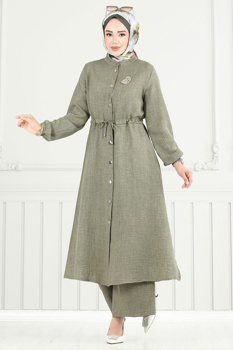 يتميز بخصر ذو أربطة. المنتج لديه ياقة نصف بيضوية. المنتج به أزرار من الأمام. البلوز تحتوي على فتحة. غير مبطنة. خصر البنطال مرن. السوار مطاطي. قد يكون هناك اختلاف في الدرجة اللونية في المنتج بسبب التقاط الصور الفوتوغرافية.