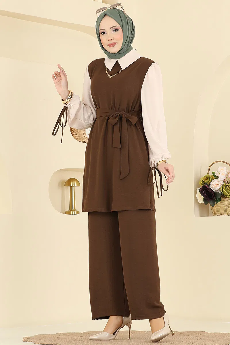 The Drawstring Cuff Aerobin Suit is a versatile Islamic clothing suitable for all seasons. This set, which can be washed gently at 30 degrees, is made from breathable aerobin fabric. The tunic features a shirt collar detail, is unlined, and provides a back zipper. The cuffs with drawstrings add an elegant touch, while the belt can be used optionally. The trousers have an elastic waist for comfort. Every detail makes this combination perfect.