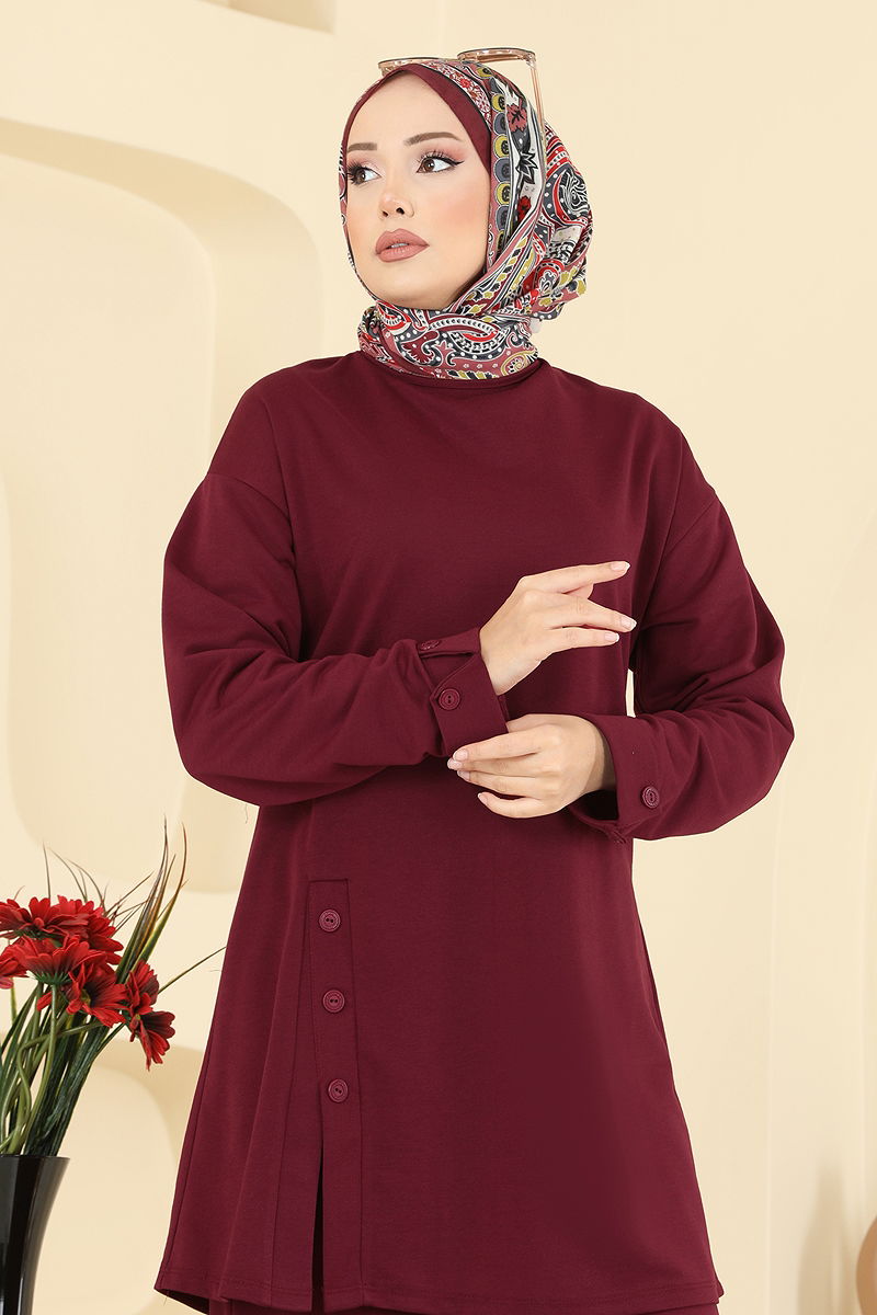 Our Slit Accessory Buttoned Suit is a stylish hijab outfit that can be comfortably worn in all seasons. Made from dual thread fabric, this ensemble features a bicycle collar tunic and elastic waist pants, offering both comfort and elegance. The front slit detail and accessory buttons on the cuffs complete the design. It can be washed at 30 degrees on a gentle cycle. The product on the model is size 38 and has a usable button at the back.