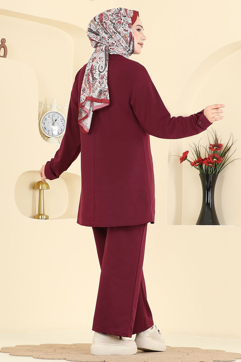 Our Slit Accessory Buttoned Suit is a stylish hijab outfit that can be comfortably worn in all seasons. Made from dual thread fabric, this ensemble features a bicycle collar tunic and elastic waist pants, offering both comfort and elegance. The front slit detail and accessory buttons on the cuffs complete the design. It can be washed at 30 degrees on a gentle cycle. The product on the model is size 38 and has a usable button at the back.