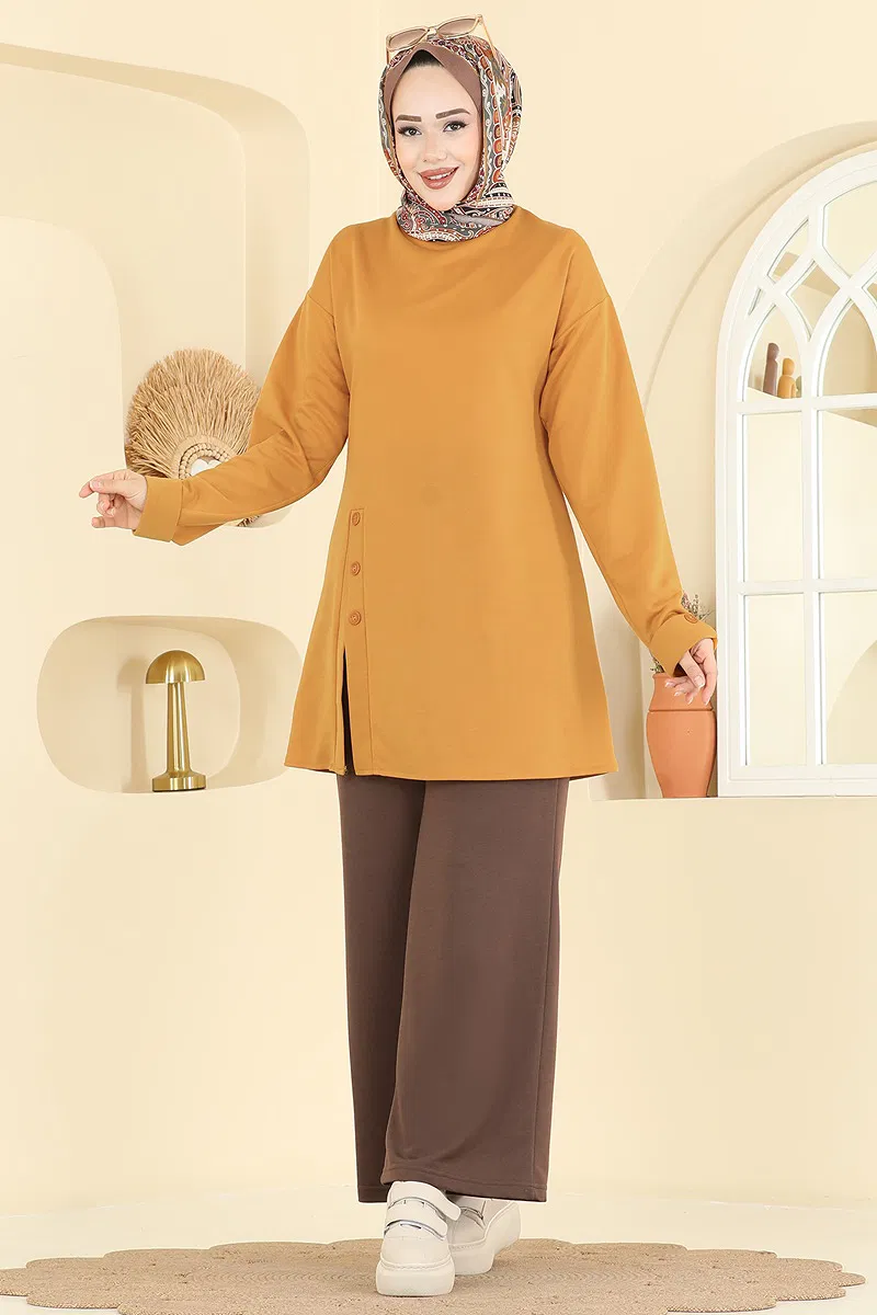 Our Slit Accessory Buttoned Suit is a stylish hijab outfit that can be comfortably worn in all seasons. Made from dual thread fabric, this ensemble features a bicycle collar tunic and elastic waist pants, offering both comfort and elegance. The front slit detail and accessory buttons on the cuffs complete the design. It can be washed at 30 degrees on a gentle cycle. The product on the model is size 38 and has a usable button at the back.