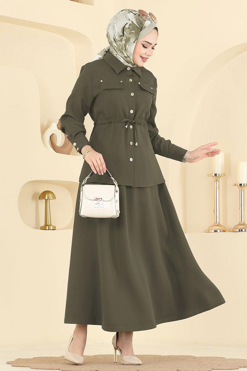 The Beli Tunneled Skirt Set is a specially designed modest wear ensemble. Suitable for all seasons, this set features a shirt collar and front button design combining elegance with practicality. The drawstring waist and elastic skirt waist provide unrestricted movement. Made from sensitive Dabil fabric, it can be washed without spinning at 30 degrees Celsius, ensuring easy maintenance. The shirt and skirt pocket details and active cuff buttons add a modern touch, while its lining-free design offers light and comfortable wear.