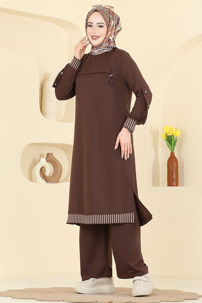 Product Name: Ribana Detailed Double Thread Set . This specially designed modest wear provides a style that can comfortably be used in all seasons. This product, which requires delicate washing, should be washed with water not exceeding 30 degrees. Made of double thread fabric, the set offers durability and comfort. With its bike neck, side-slit tunic, and elastic waist pants design, it presents a modern and chic look. The tunic features a functional button at the back and elegant lace details for aesthetic sophistication. The tunic and pants set combines comfort and style seamlessly.
