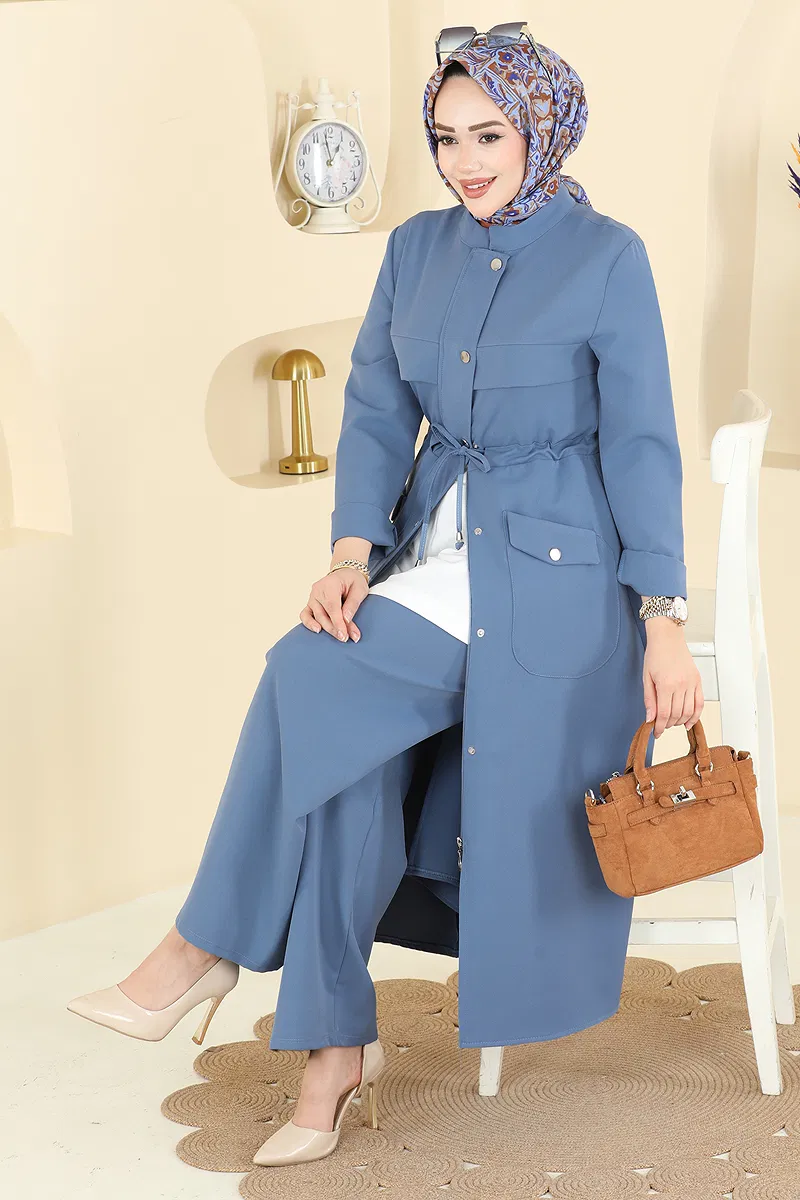 The Beli Tunnelli Dabıl Suit is a modest wear suitable for all seasons. It can be washed gently at 30 degrees, making it practical to maintain. Made from Dabıl fabric, this suit features a semi-Stand collar and front-button design. Its unlined structure offers light and comfortable wear. The drawstring waist and elastic pant waist ensure a perfect fit, while both the coat and pants have pockets, enhancing functionality.