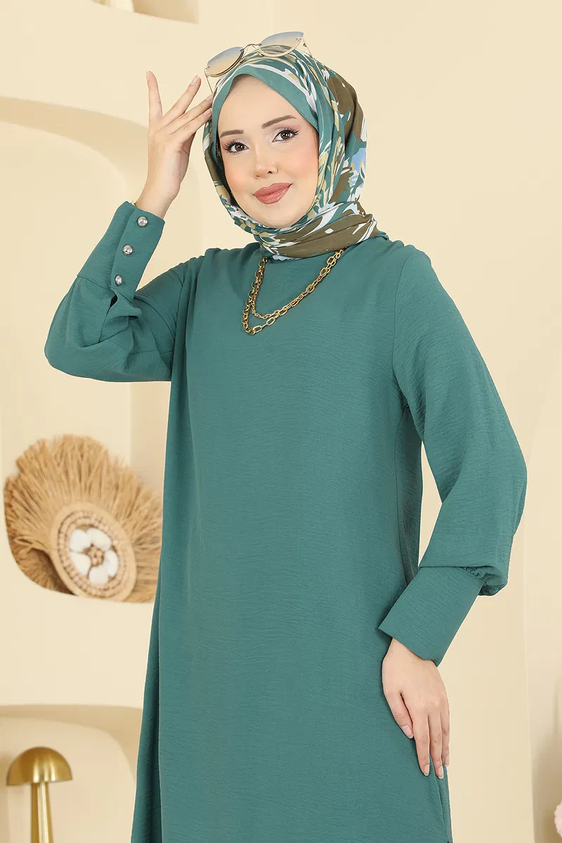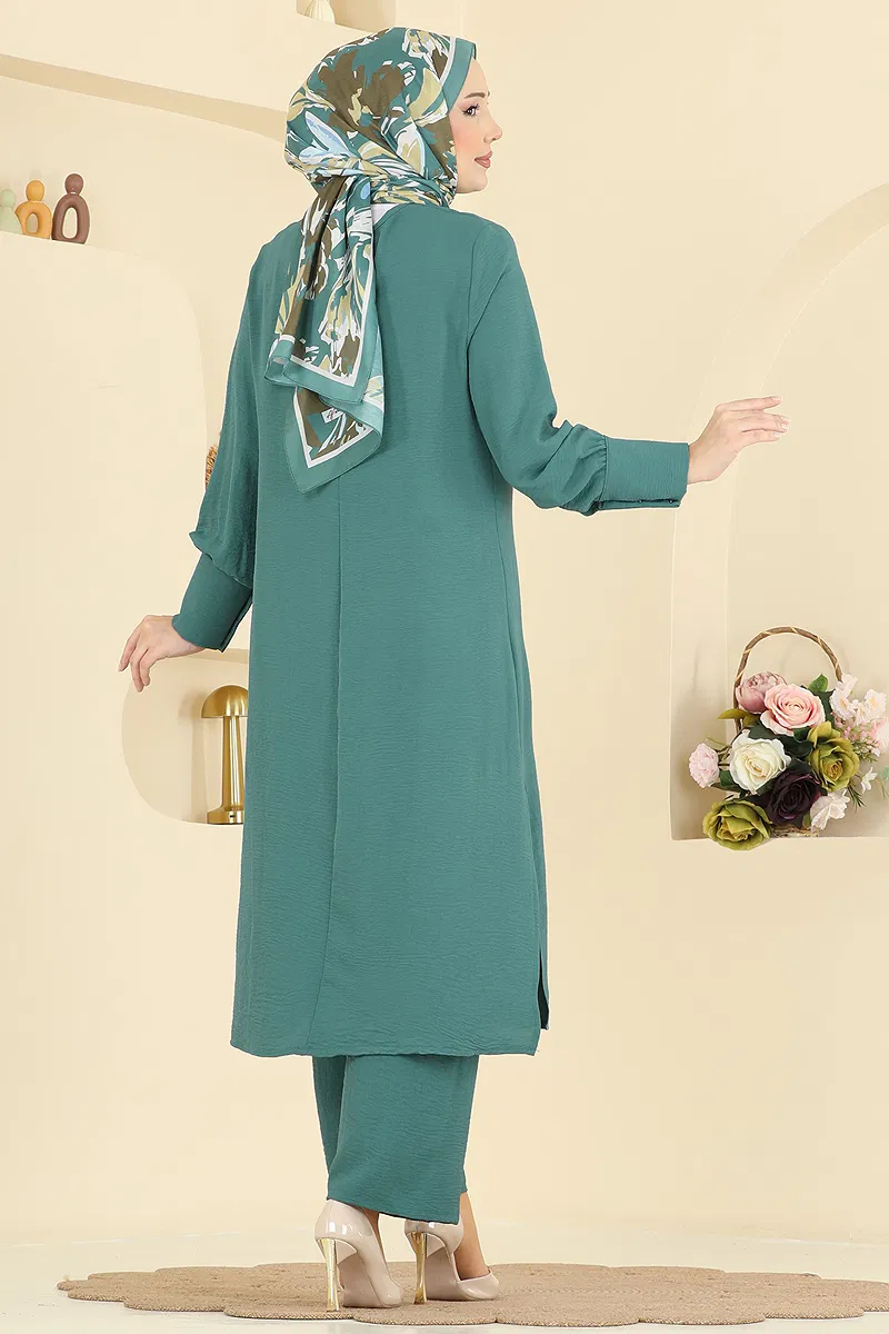 Experience both comfort and style with the Cuffed Button Aerobin Set, featuring a bicycle neckline and a slit on the side of the tunic. Suitable for all four seasons, this modest clothing item is made from aerobin fabric and can be washed gently at 30 degrees. The tunic boasts a back button detail and the trousers include an elastic waist, with active cuff buttons. An ideal choice for your comfort and elegance!