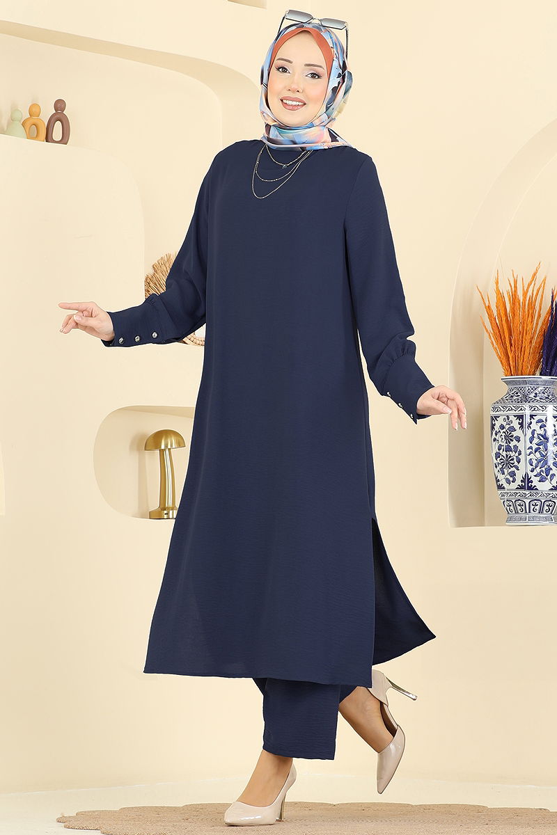 Experience both comfort and style with the Cuffed Button Aerobin Set, featuring a bicycle neckline and a slit on the side of the tunic. Suitable for all four seasons, this modest clothing item is made from aerobin fabric and can be washed gently at 30 degrees. The tunic boasts a back button detail and the trousers include an elastic waist, with active cuff buttons. An ideal choice for your comfort and elegance!