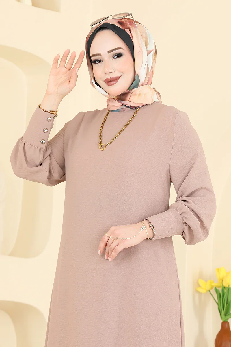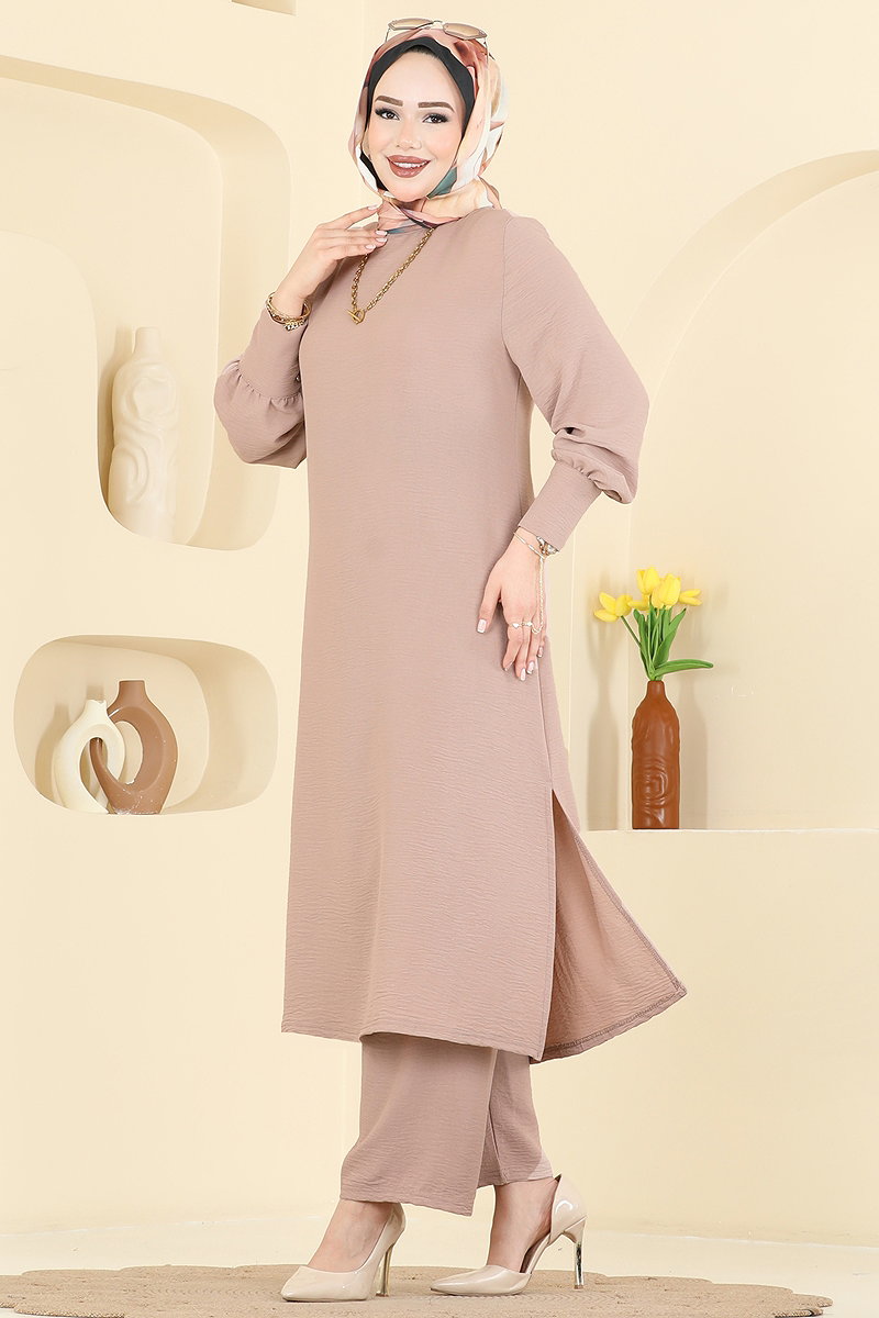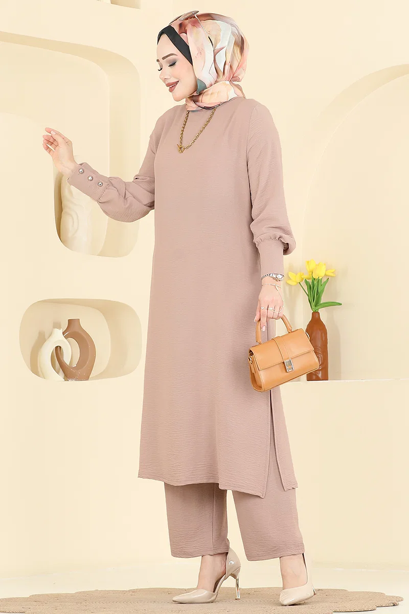 Experience both comfort and style with the Cuffed Button Aerobin Set, featuring a bicycle neckline and a slit on the side of the tunic. Suitable for all four seasons, this modest clothing item is made from aerobin fabric and can be washed gently at 30 degrees. The tunic boasts a back button detail and the trousers include an elastic waist, with active cuff buttons. An ideal choice for your comfort and elegance!