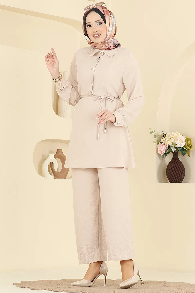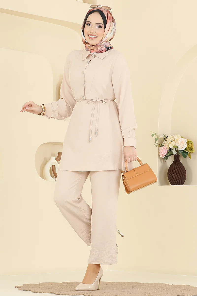 Elegant and practical, the Belt-Detailed Aerobin Set reflects the modest fashion with a modern twist. Suitable for all seasons, this set promises all-day comfort with aerobin fabric and is recommended for delicate wash. The tunic features a shirt collar and a half-button front for ease, while the active cuff buttons add functionality. The matching pants have an elastic waist, and the belt is an optional accessory, providing flexibility in style. This ensemble will become an indispensable part of your wardrobe, ensuring an elegant appearance in any setting.