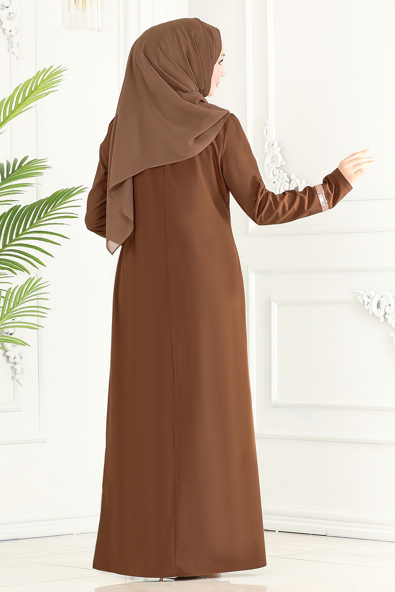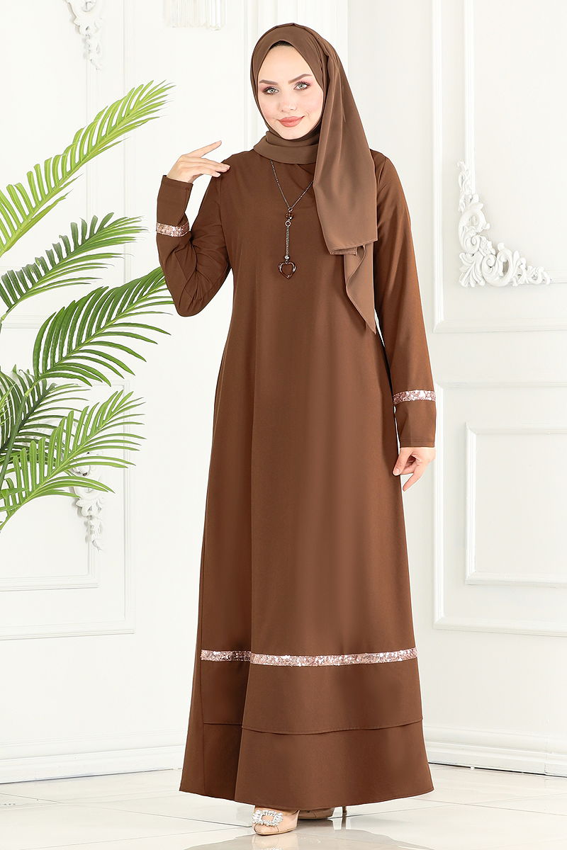 Kolyeli Krep Dress DRESS model is a hijab product. It can be used in Four Season seasons. It should be washed at 30 degrees without squeezing. It is made of first class Krep fabric. The product has a Bicycle collar. The product is buttoned from the back. It is unlined. (The product on the model is size 38.) The necklace is included with the product and may be optionally used.