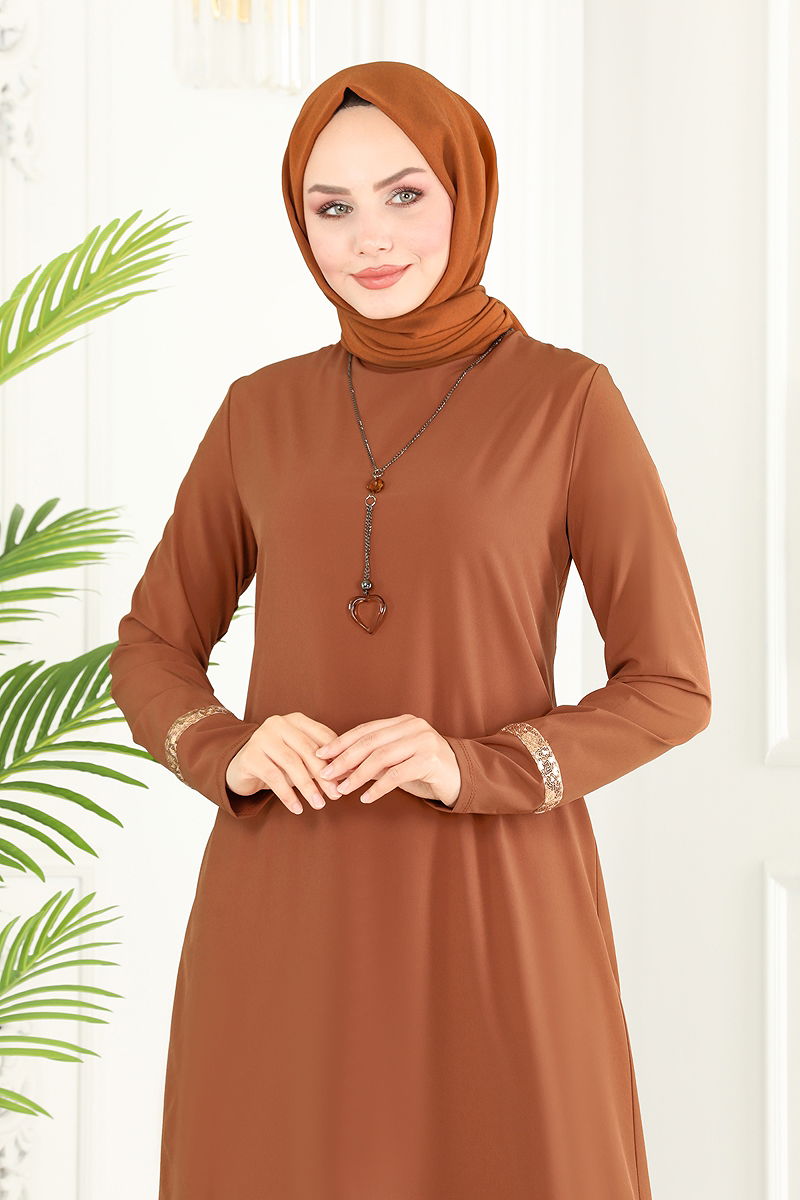 Kolyeli Krep Dress DRESS model is a hijab product. It can be used in Four Season seasons. It should be washed at 30 degrees without squeezing. It is made of first class Krep fabric. The product has a Bicycle collar. The product is buttoned from the back. It is unlined. (The product on the model is size 38.) The necklace is included with the product and may be optionally used.