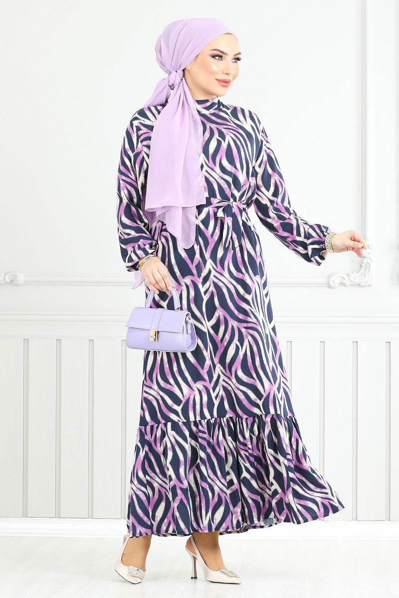 Dalga Desenli Viskon Elbise Lila