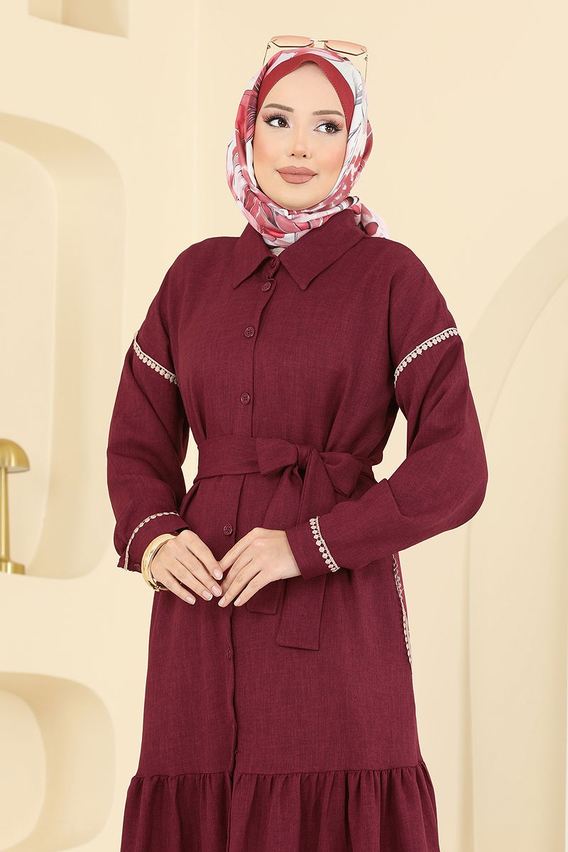 Dantel Detaylı Kemerli Elbise 4130PM271 Bordo