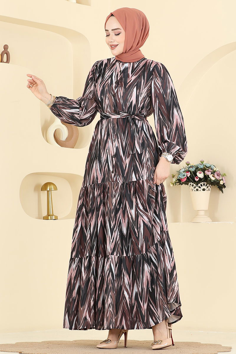 Desenli Eteği Volanlı Elbise 4464BRZ597 Kahve