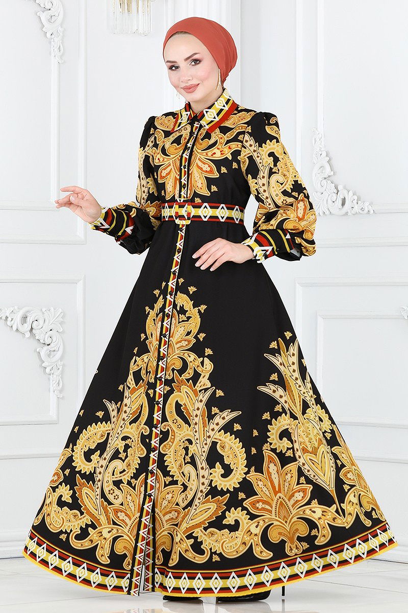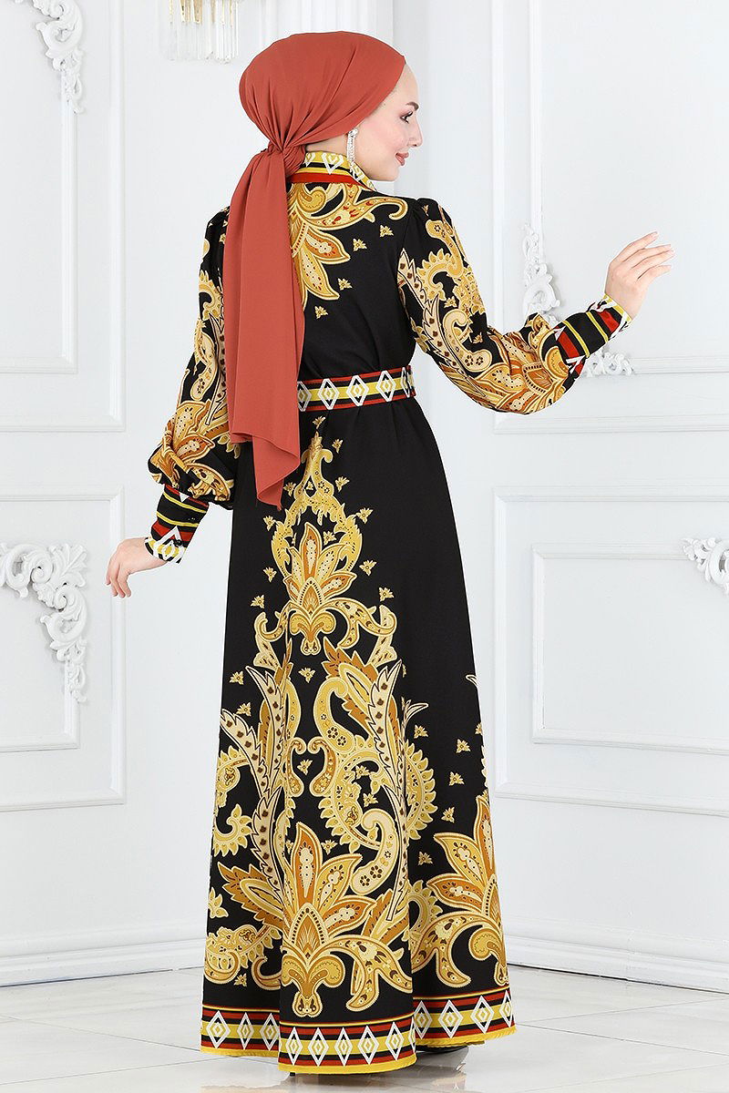 Desenli Kemerli Elbise 2395JNF844 Siyah&Oranj