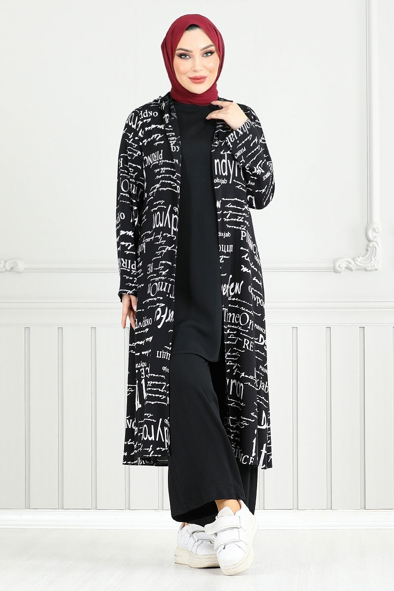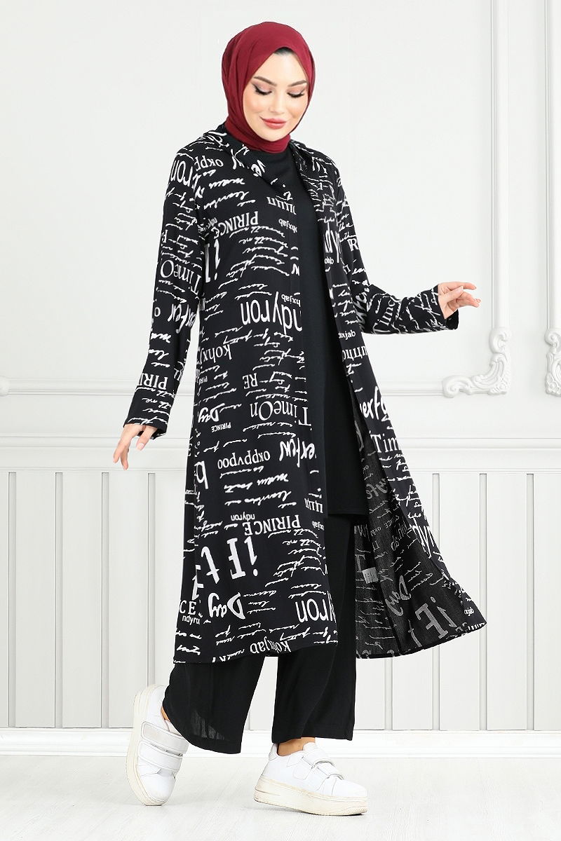 Desenli Üçlü Tesettür Kombin 4012BGS895-M Siyah