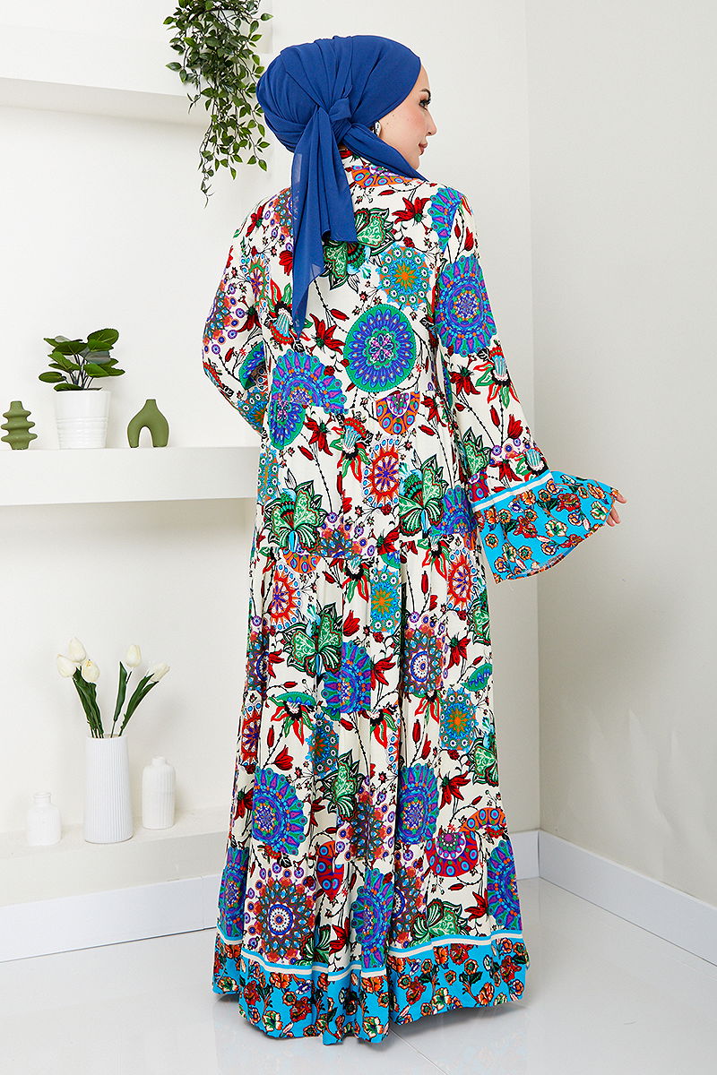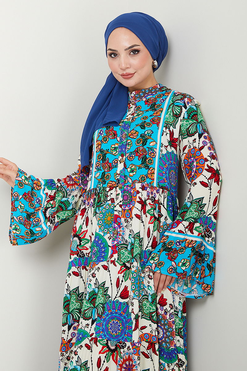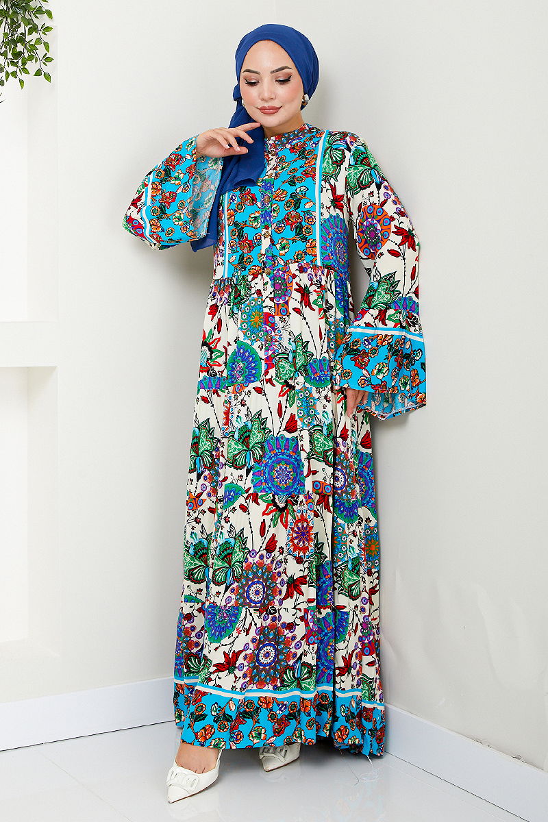 Desenli Viskon Elbise MDP7113-M Mavi