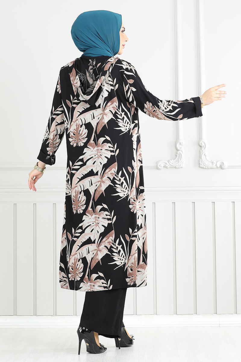 Desenli Viskon Tesettür Takım, her mevsim rahatlık ve şıklık sunan bir üründür. Elde yıkanması önerilen bu tesettür takım, viskon kumaştan imal edilerek yüksek konfor sağlar. Kapşonlu yaka tasarımı ve astarsız yapısı ile modern bir görünüme sahiptir. Kombin, içi kolsuz bir bluz ve lastikli bel pantolondan oluşmaktadır.Bluz Sırt kısmında pratik bir düğme detayına sahip olan bu takım, zarif detaylarıyla ön plana çıkar.