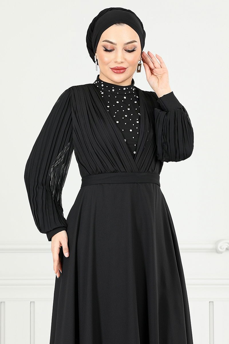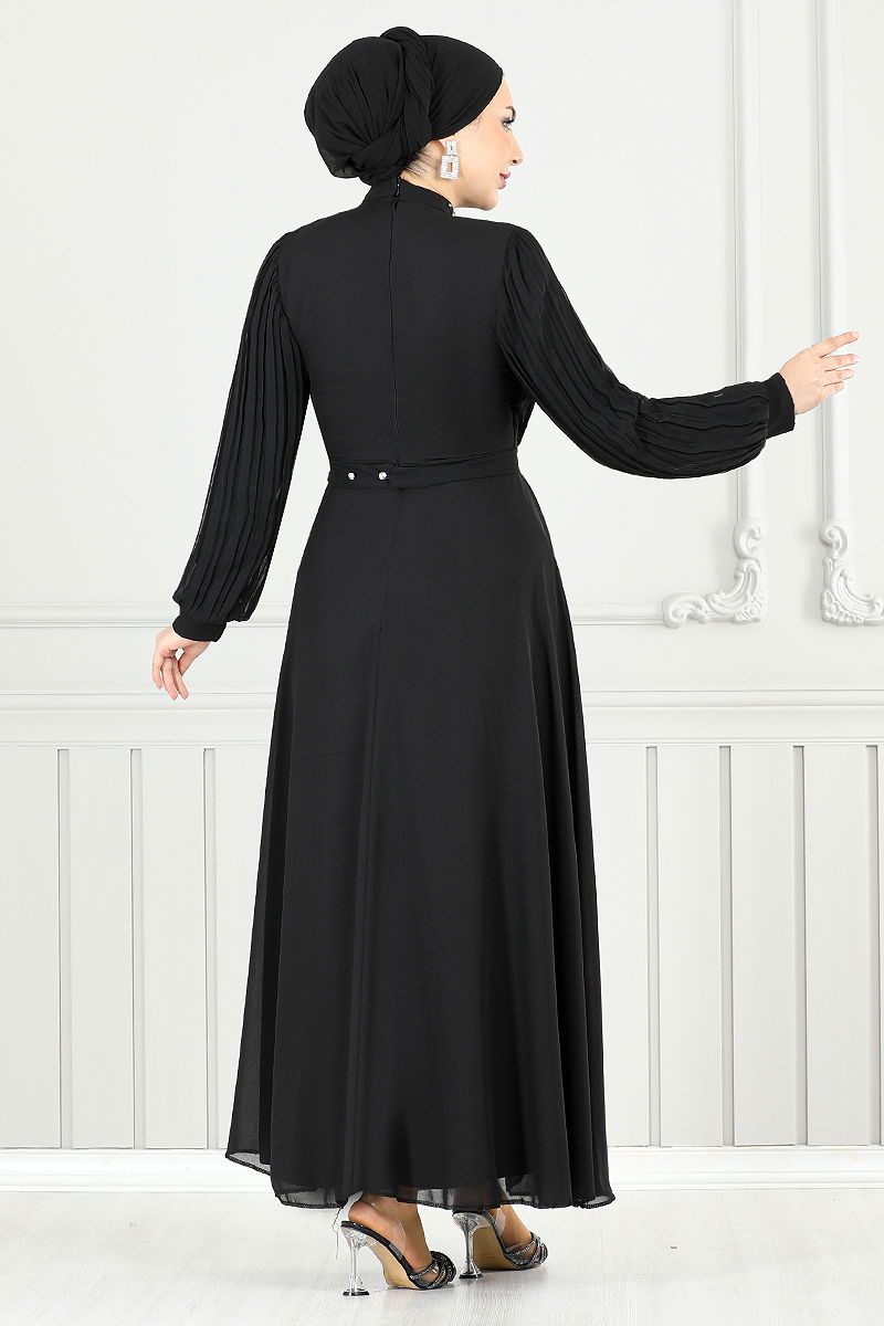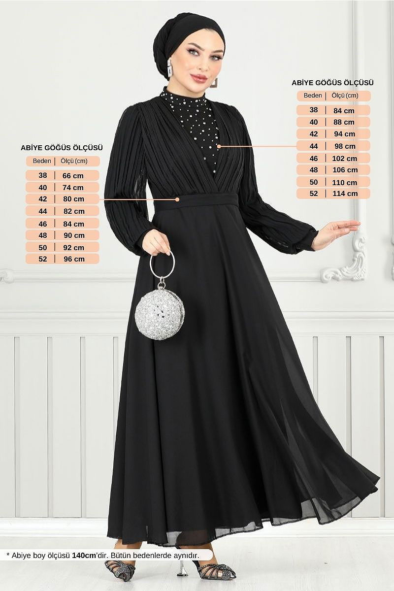 Elegance meets comfort with the Drape Detail Beaded Evening Dress, making you stand out at any special event throughout the year. This modest dress offers a modern and chic appearance. Made from lightweight and lined chiffon fabric, it ensures comfortable wear. The dress dazzles with pearl and gemstone details and features a zipper at the back for ease of use. The belt detail, stitched at both ends with a loose middle, adds an elegant touch and is included with the dress, offering versatile styling options. Only dry cleaning is recommended for this exquisite piece, destined to become a staple in your wardrobe.