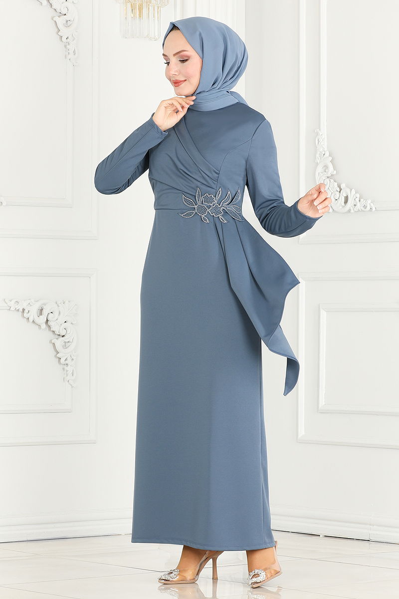 Drapeli Kalem Abiye Elbise ASM2580 Açık İndigo