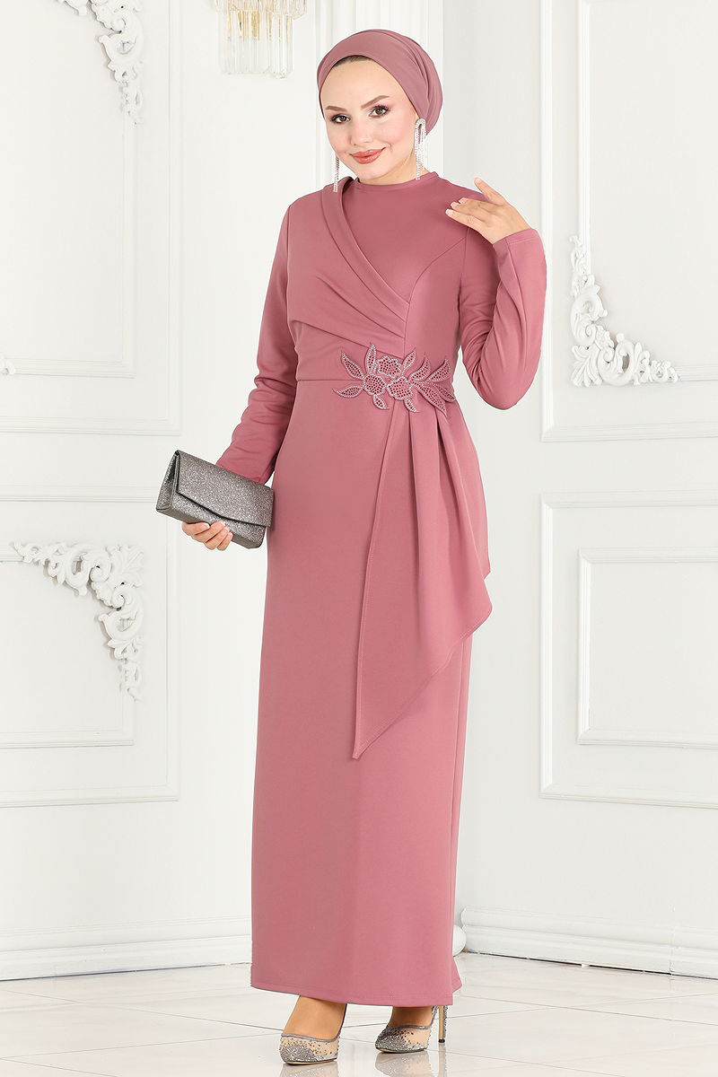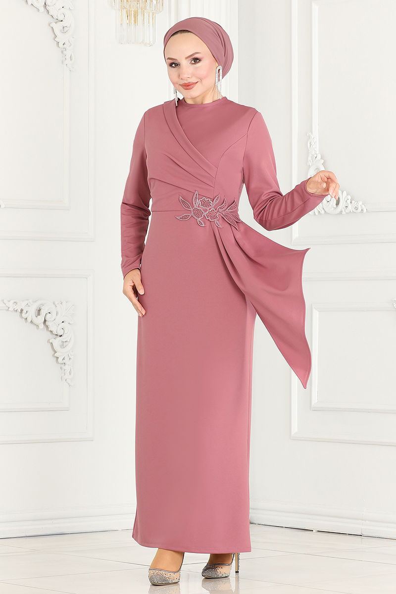 Drapeli Kalem Abiye Elbise Gül Kurusu