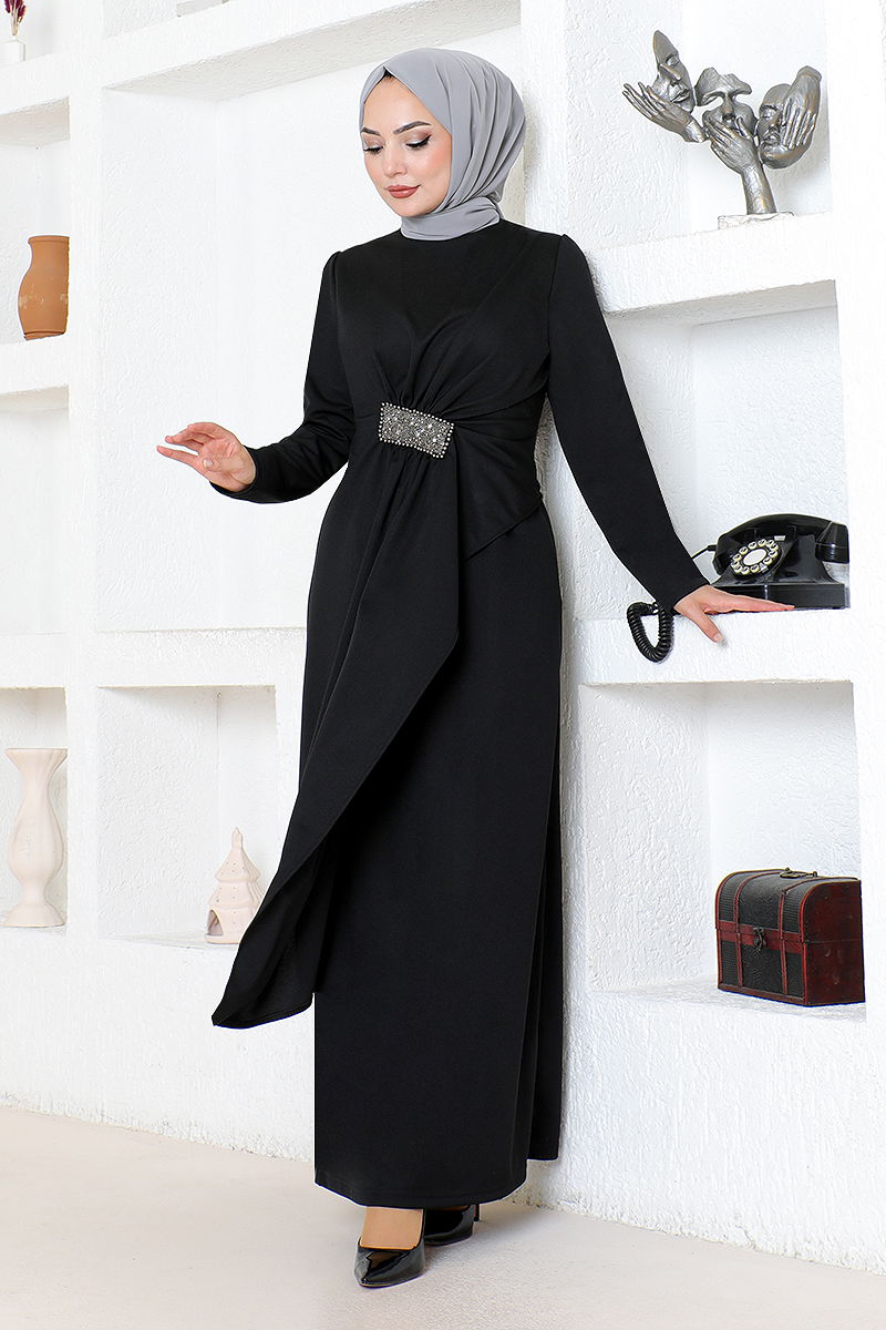 Drapeli Taş İşlemeli Abiye 5020SL890 Siyah