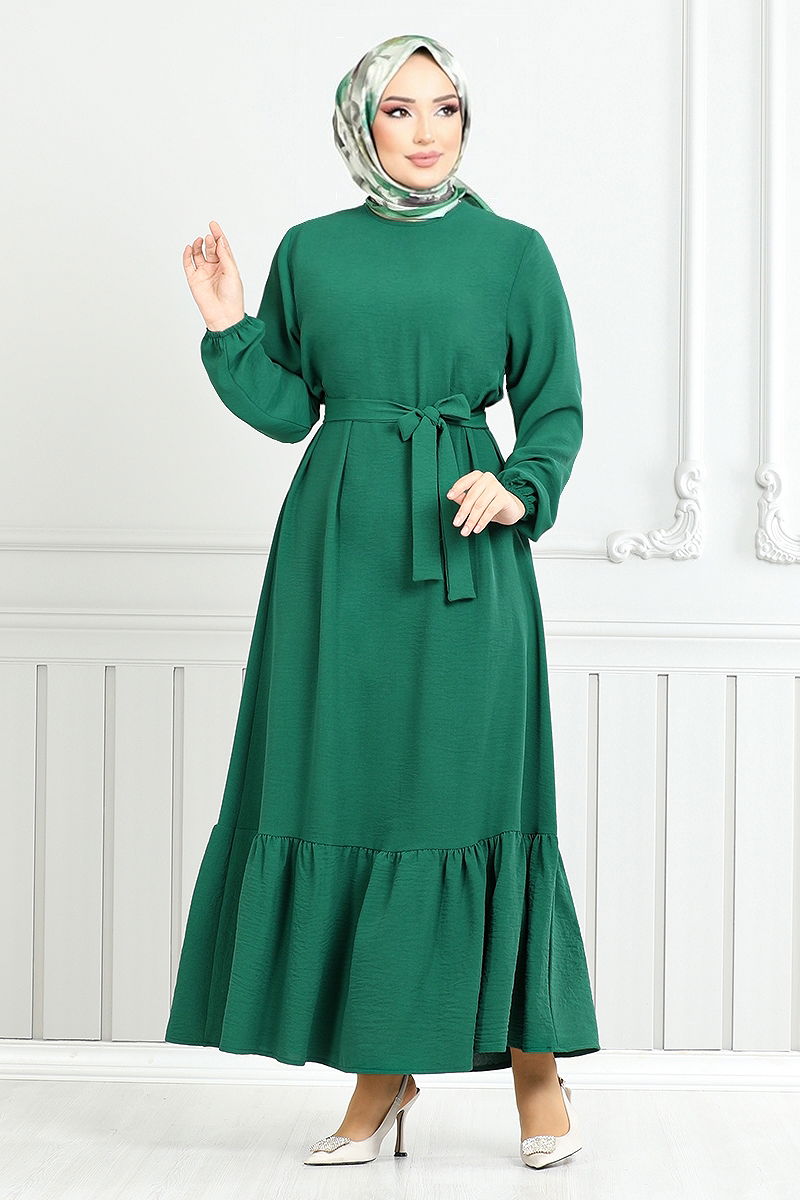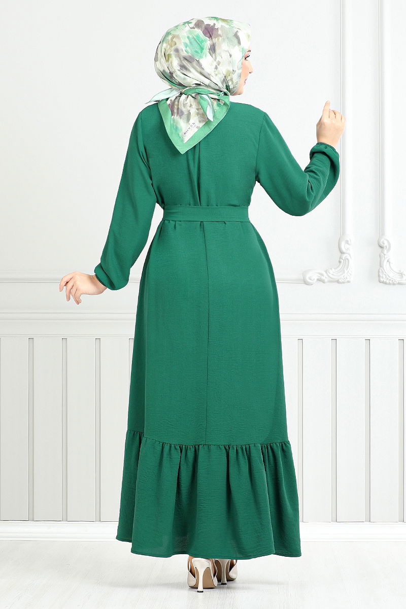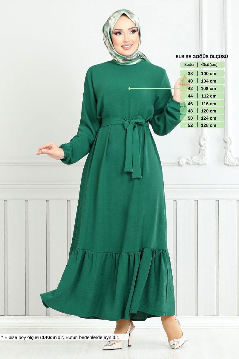 This stylish Manşeti Elasticated Aerobin Dress is perfect for all seasons. It features elasticated cuffs, an elegant bicycle collar, and a belt detail that adds a modern and chic look. Washable at 30 degrees on a delicate cycle. Thanks to its Aerobin fabric, it's lightweight and comfortable, with an unlined design for excellent breathability. The button at the back makes it easy to wear and remove. Use its own belt or enhance your look with a different accessory belt as desired.