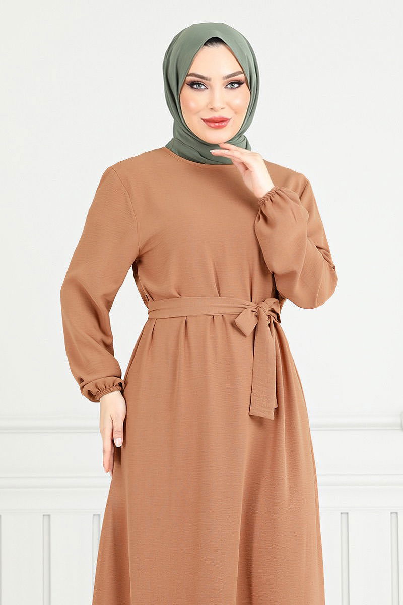 This stylish Manşeti Elasticated Aerobin Dress is perfect for all seasons. It features elasticated cuffs, an elegant bicycle collar, and a belt detail that adds a modern and chic look. Washable at 30 degrees on a delicate cycle. Thanks to its Aerobin fabric, it's lightweight and comfortable, with an unlined design for excellent breathability. The button at the back makes it easy to wear and remove. Use its own belt or enhance your look with a different accessory belt as desired.
