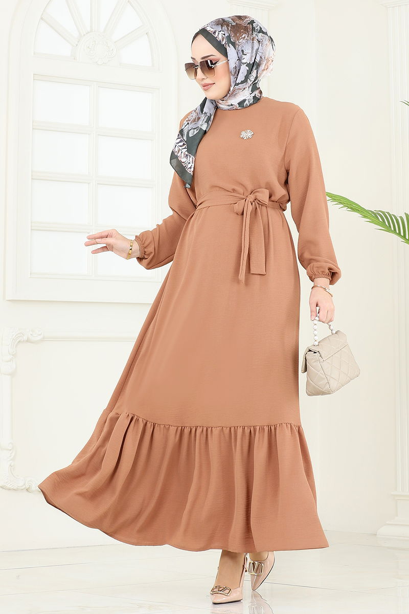This elegant Elastic Cuffed Aerobin Dress adds a modern touch to modest wear. Comfortable for all seasons, its light and breathable aerobin fabric ensures comfort all day long. Easy to maintain with a gentle wash at 30 degrees. Its crew neck and elastic cuffs offer both style and functionality. The back button detail makes it practical to use. The included belt can be styled differently but its use is optional. Accessories are not included.
