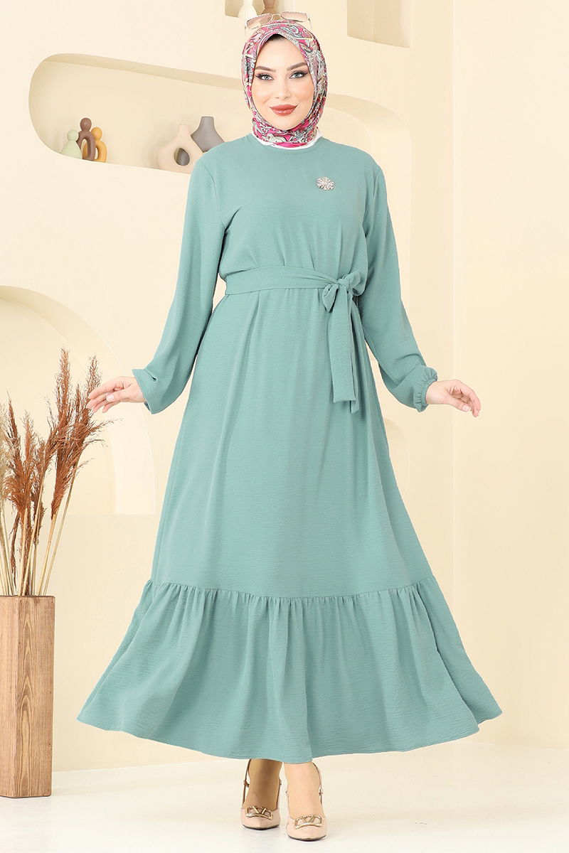 This elegant Elastic Cuffed Aerobin Dress adds a modern touch to modest wear. Comfortable for all seasons, its light and breathable aerobin fabric ensures comfort all day long. Easy to maintain with a gentle wash at 30 degrees. Its crew neck and elastic cuffs offer both style and functionality. The back button detail makes it practical to use. The included belt can be styled differently but its use is optional. Accessories are not included.