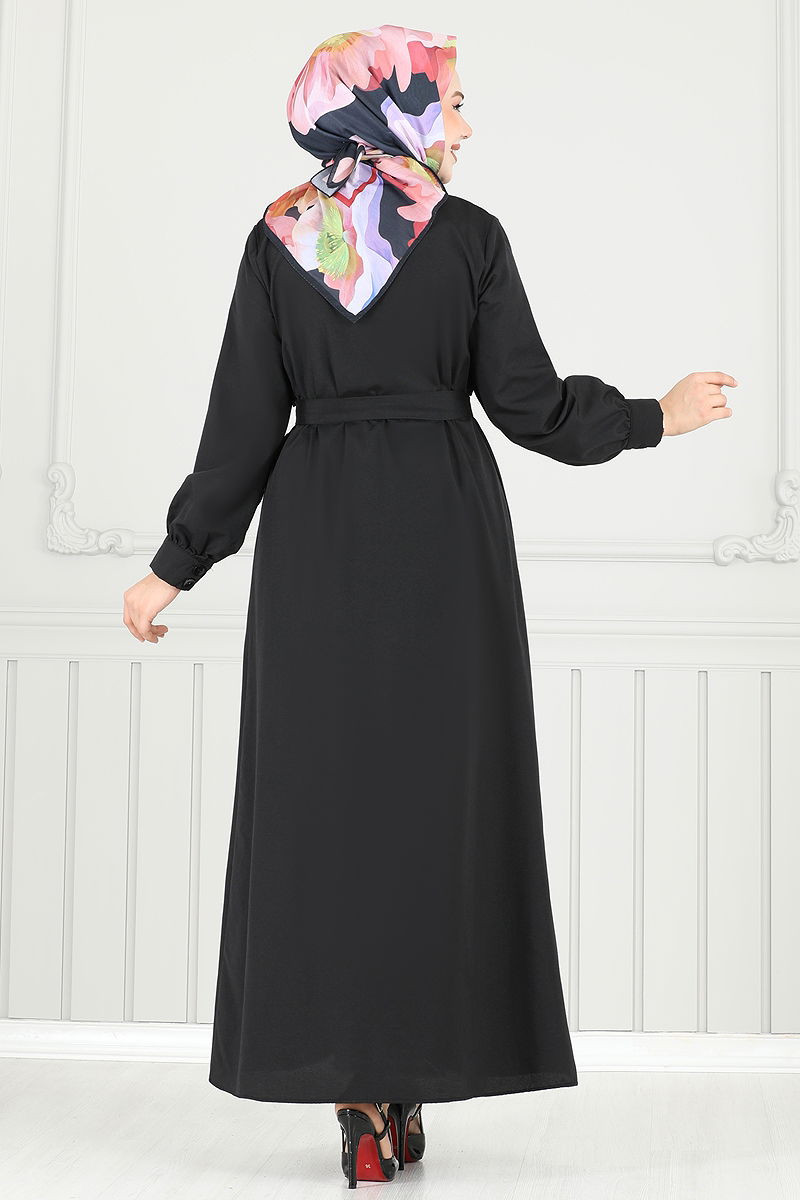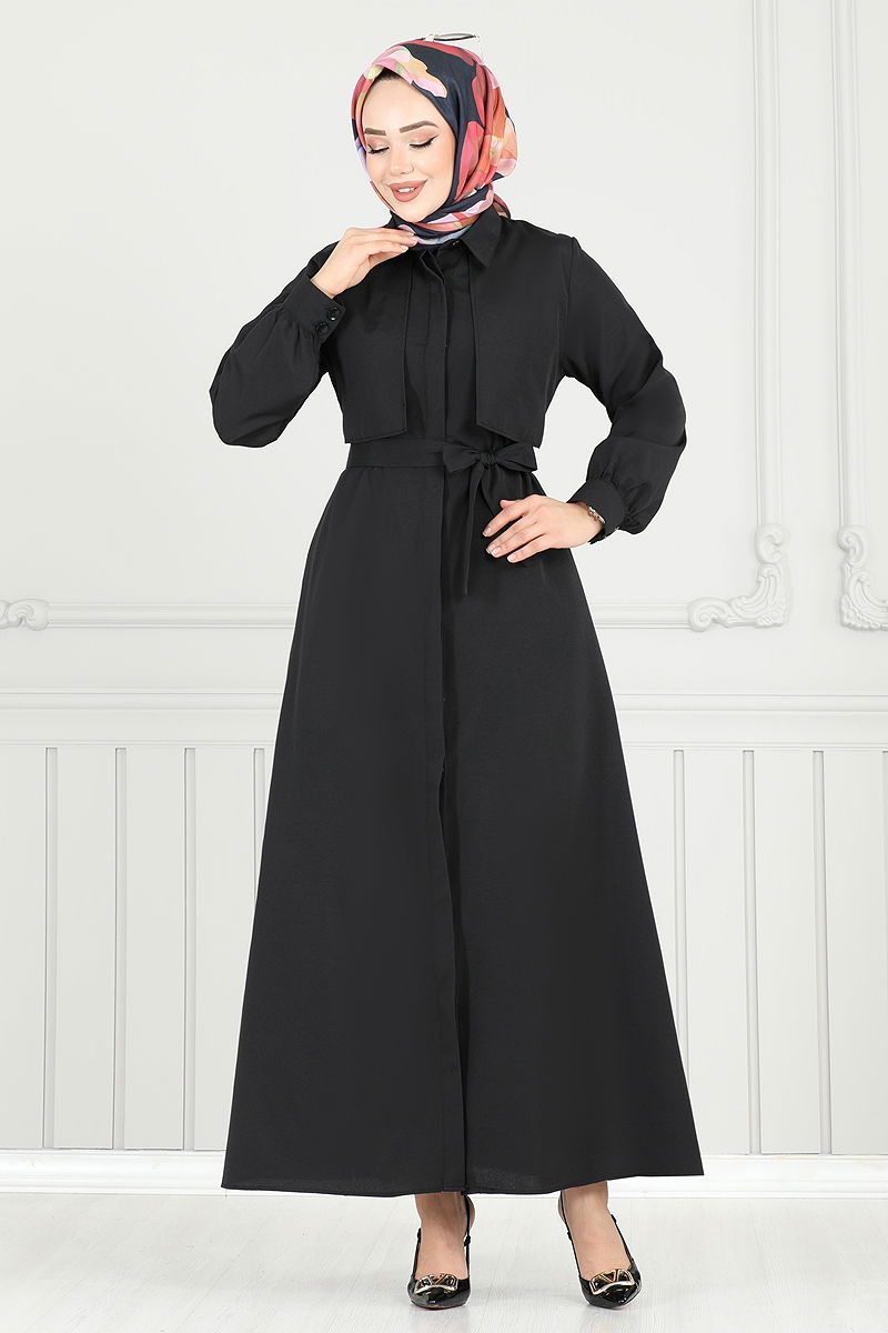 The Bolera Detail Dress Abaya is a specially designed modest wear piece suitable for all seasons. It can be gently washed at 30 degrees and is easy to care for. Made from terrycotton fabric, this item features a shirt-collar design and hidden buttons that offer an elegant look. Its unlined structure makes it lightweight and comfortable. The measurements for the size 38 worn by the model are: height 165 cm, chest 88 cm, waist 68 cm, hips 99 cm, and weight 56 kg. The included belt has stitched ends to prevent fluttering and can be optionally not used. The cuff buttons are functional, allowing for easy adjustments.