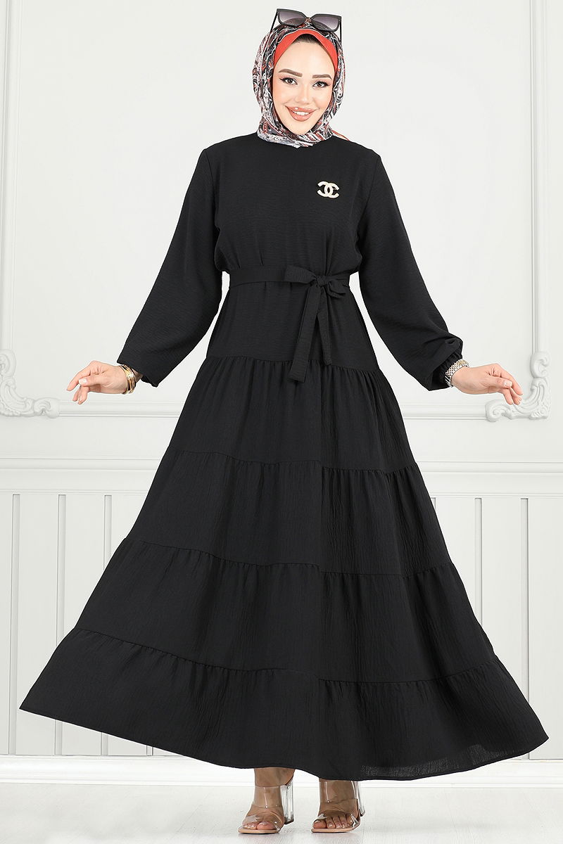 Layered Skirt Aerobin Dress is a modest wear suitable for all seasons. This garment can be washed at 30 degrees with delicate care. Made from aerobin fabric, the dress features a bicycle collar design that stands out. It is unlined and has a button on the back for practical dressing. The cuffs are elasticated, and it includes a belt that offers various styling options. The belt is designed to prevent waving and can be optionally used.