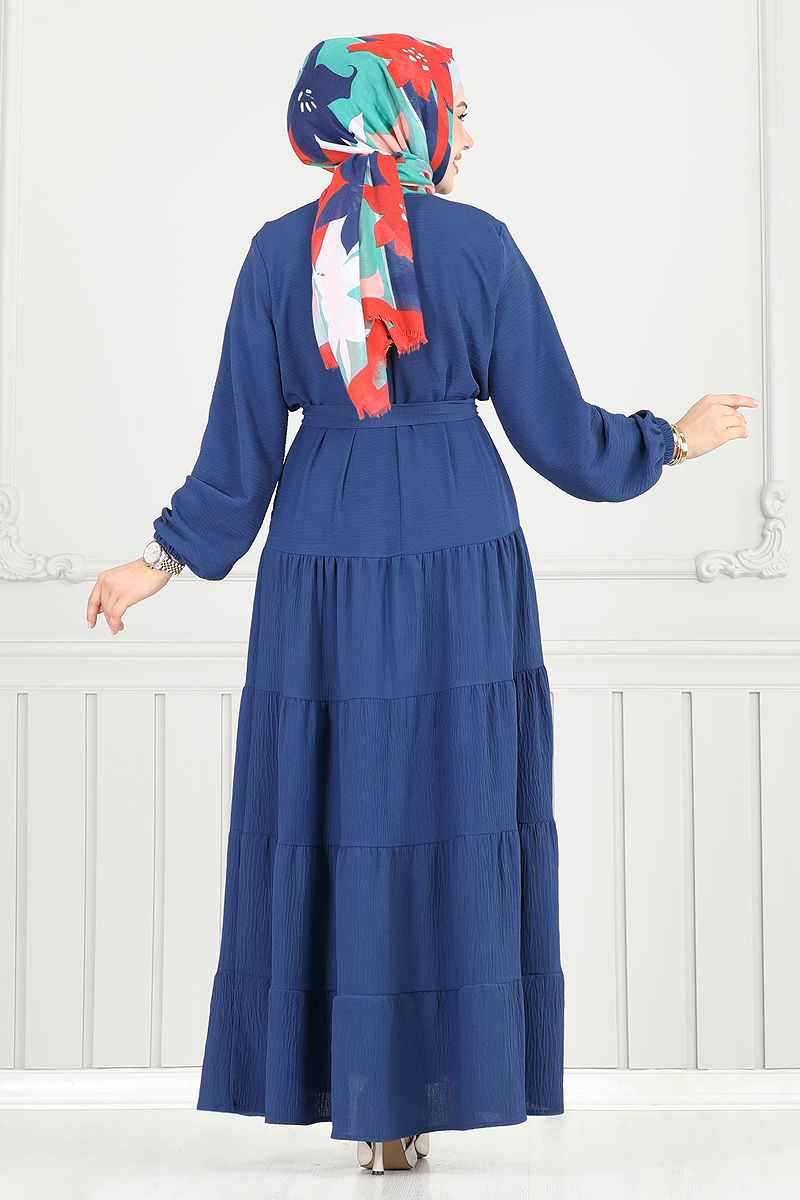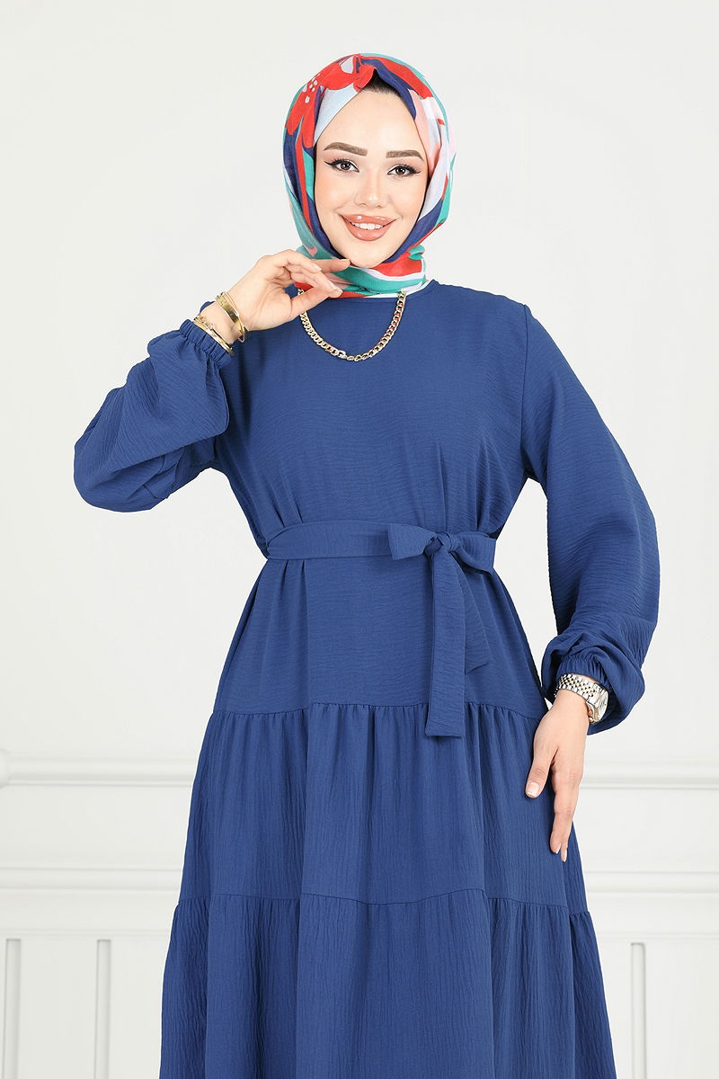 Layered Skirt Aerobin Dress is a modest wear suitable for all seasons. This garment can be washed at 30 degrees with delicate care. Made from aerobin fabric, the dress features a bicycle collar design that stands out. It is unlined and has a button on the back for practical dressing. The cuffs are elasticated, and it includes a belt that offers various styling options. The belt is designed to prevent waving and can be optionally used.