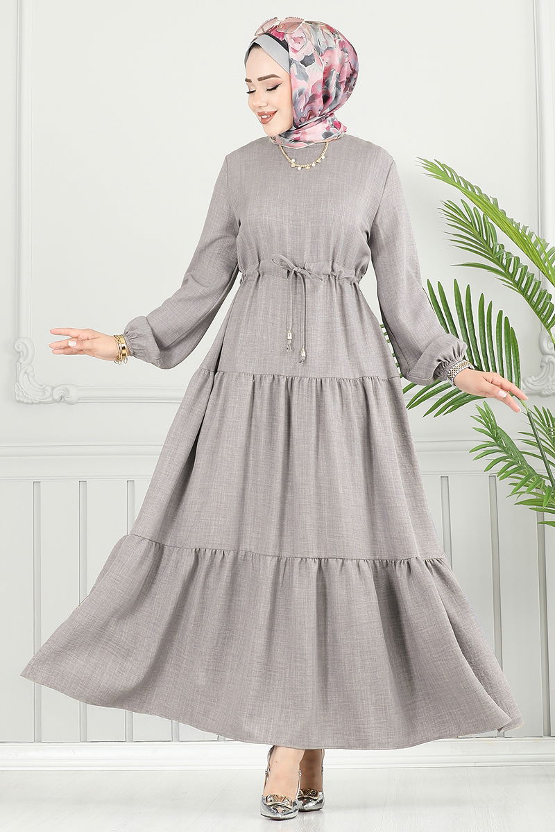 The Layered Skirt Sofia Dress is specially designed for modest dress. Suitable for all seasons, this model can be washed at 30 degrees on a delicate setting. Made from Sofia linen fabric, it is durable and elegant. It has a crew neck and is unlined for a modern touch. Featuring a button at the back and a drawstring waist, the dress increases comfort with its elasticated cuffs. The product displayed on the model is size 38, ensuring you remain stylish in every setting.