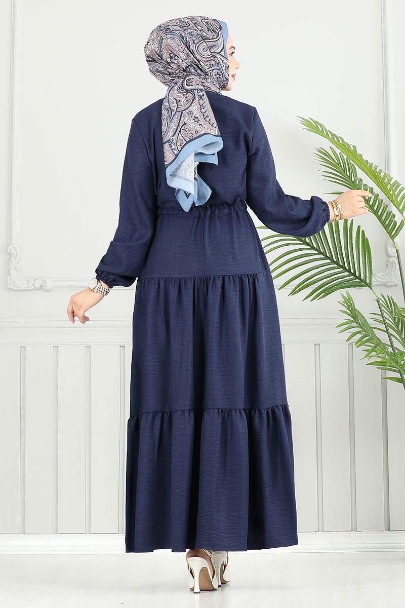 The Layered Skirt Sofia Dress is specially designed for modest dress. Suitable for all seasons, this model can be washed at 30 degrees on a delicate setting. Made from Sofia linen fabric, it is durable and elegant. It has a crew neck and is unlined for a modern touch. Featuring a button at the back and a drawstring waist, the dress increases comfort with its elasticated cuffs. The product displayed on the model is size 38, ensuring you remain stylish in every setting.