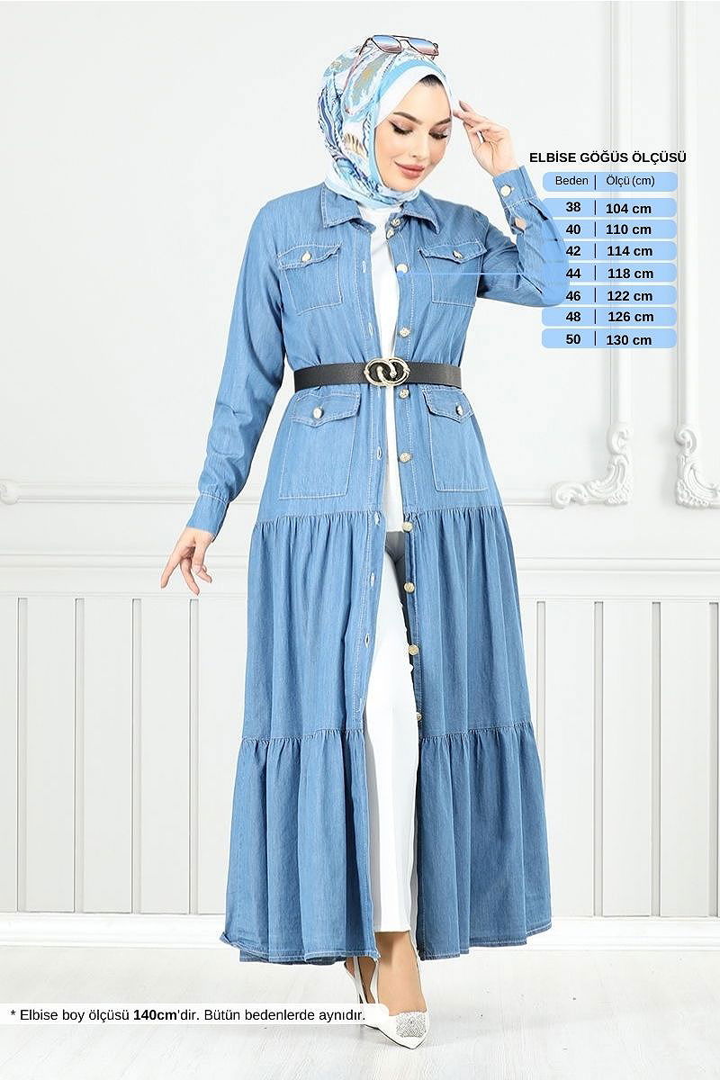 The Belted Tensel Denim Dress is a modest fashion item perfectly suitable for all seasons. Recommended to be washed delicately at 30 degrees. Crafted from a unique combination of Tensel and denim, this dress features a shirt collar and a button front closure for a classic and elegant look. Its unlined structure ensures lightweight and comfortable wear. The belt ends are stitched, and it can be optionally removed. With active cuff buttons and available pockets, it provides functionality while showcasing a size 38 model on display.